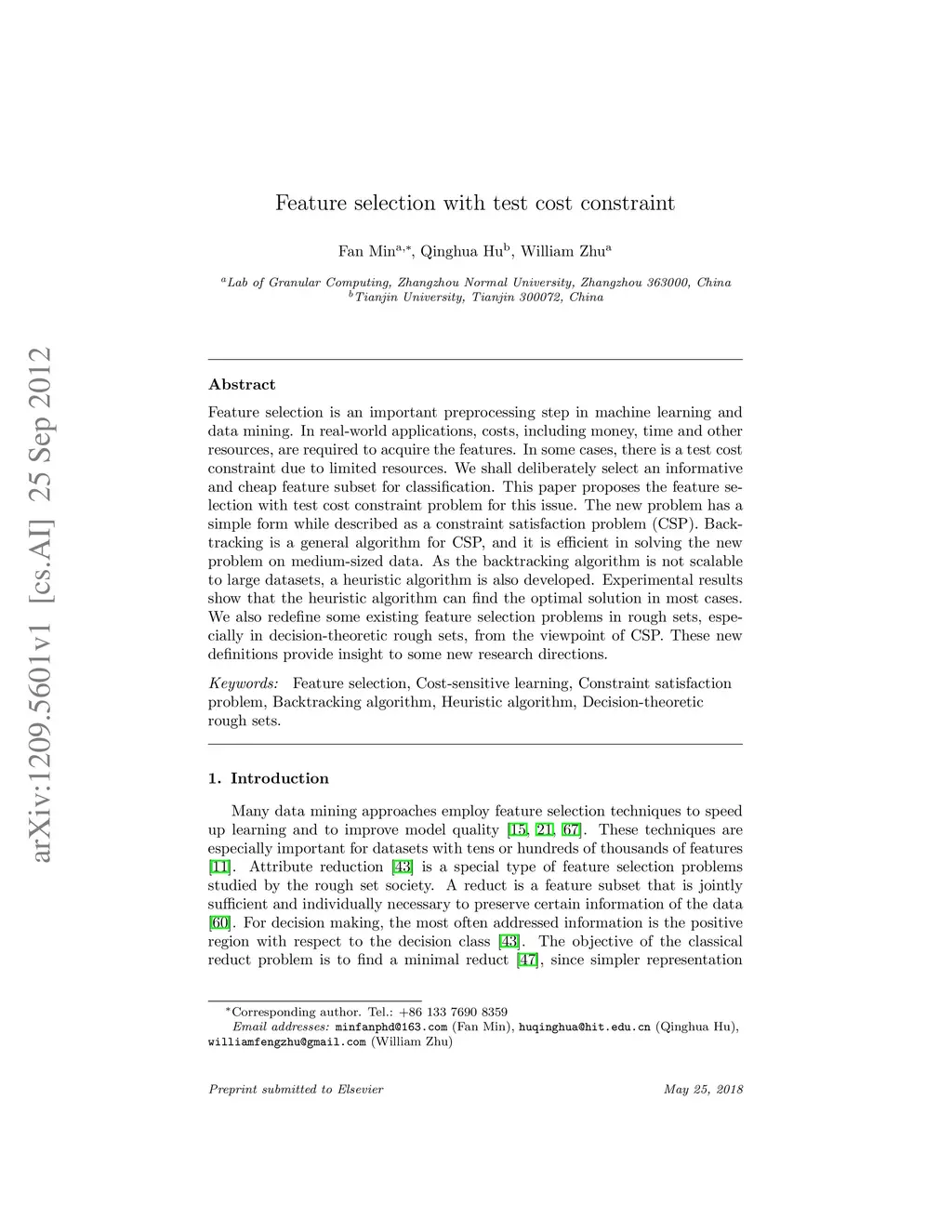 Feature selection is an important preprocessing step in machine learning and data mining. In real-world applications, costs, including money, time and other resources, are required to acquire the features. In some cases, there is a test cost constraint due to limited resources. We shall deliberately select an informative and cheap feature subset for classification. This paper proposes the feature selection with test cost constraint problem for this issue. The new problem has a simple form while described as a constraint satisfaction problem (CSP). Backtracking is a general algorithm for CSP, and it is efficient in solving the new problem on medium-sized data. As the backtracking algorithm is not scalable to large datasets, a heuristic algorithm is also developed. Experimental results show that the heuristic algorithm can find the optimal solution in most cases. We also redefine some existing feature selection problems in rough sets, especially in decision-theoretic rough sets, from the viewpoint of CSP. These new definitions provide insight to some new research directions.