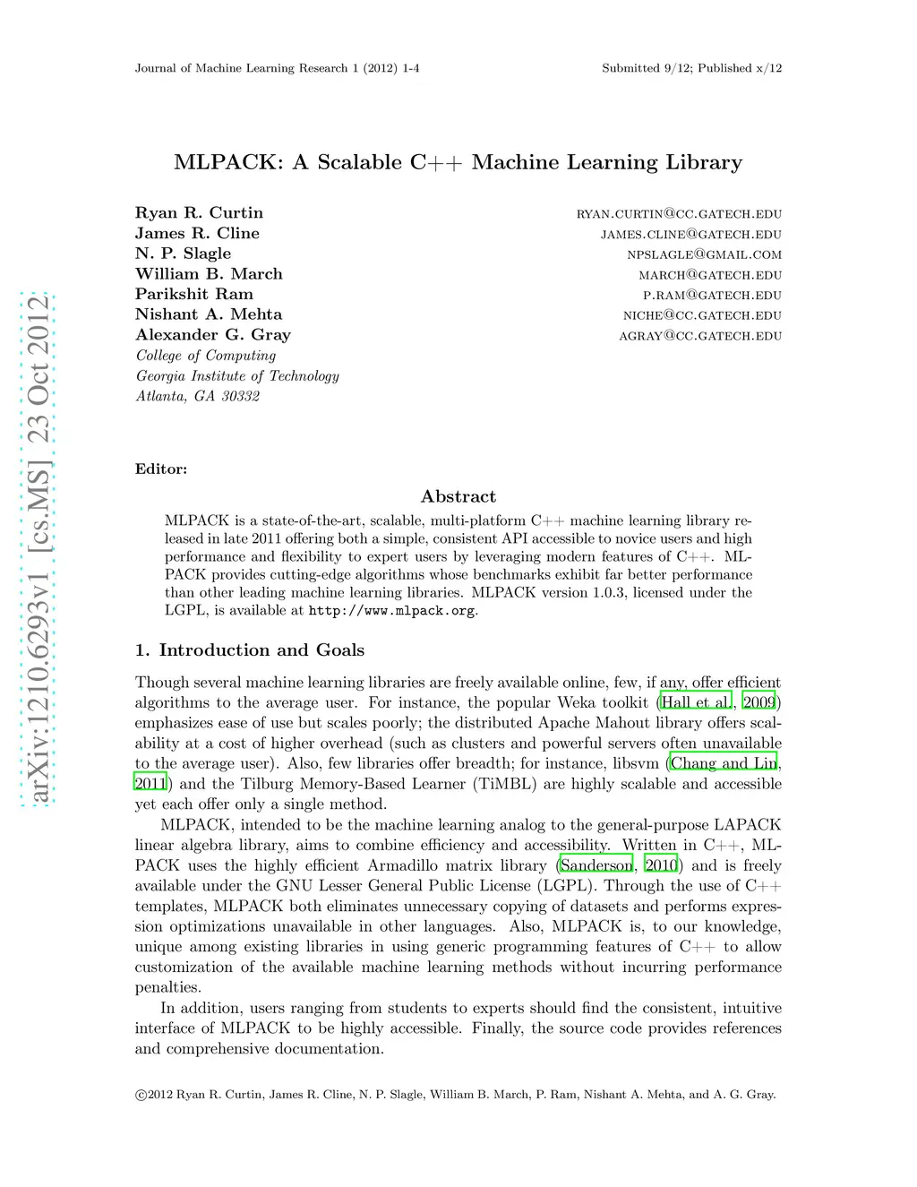 MLPACK is a state-of-the-art, scalable, multi-platform C++ machine learning library released in late 2011 offering both a simple, consistent API accessible to novice users and high performance and flexibility to expert users by leveraging modern features of C++. MLPACK provides cutting-edge algorithms whose benchmarks exhibit far better performance than other leading machine learning libraries. MLPACK version 1.0.3, licensed under the LGPL, is available at http://www.mlpack.org.