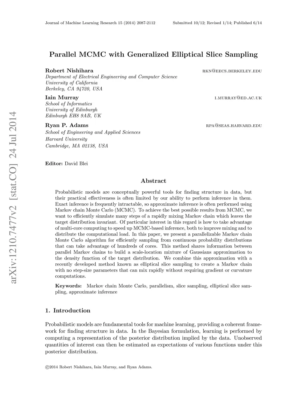 Probabilistic models are conceptually powerful tools for finding structure in data, but their practical effectiveness is often limited by our ability to perform inference in them. Exact inference is frequently intractable, so approximate inference is often performed using Markov chain Monte Carlo (MCMC). To achieve the best possible results from MCMC, we want to efficiently simulate many steps of a rapidly mixing Markov chain which leaves the target distribution invariant. Of particular interest in this regard is how to take advantage of multi-core computing to speed up MCMC-based inference, both to improve mixing and to distribute the computational load. In this paper, we present a parallelizable Markov chain Monte Carlo algorithm for efficiently sampling from continuous probability distributions that can take advantage of hundreds of cores. This method shares information between parallel Markov chains to build a scale-mixture of Gaussians approximation to the density function of the target distribution. We combine this approximation with a recent method known as elliptical slice sampling to create a Markov chain with no step-size parameters that can mix rapidly without requiring gradient or curvature computations.