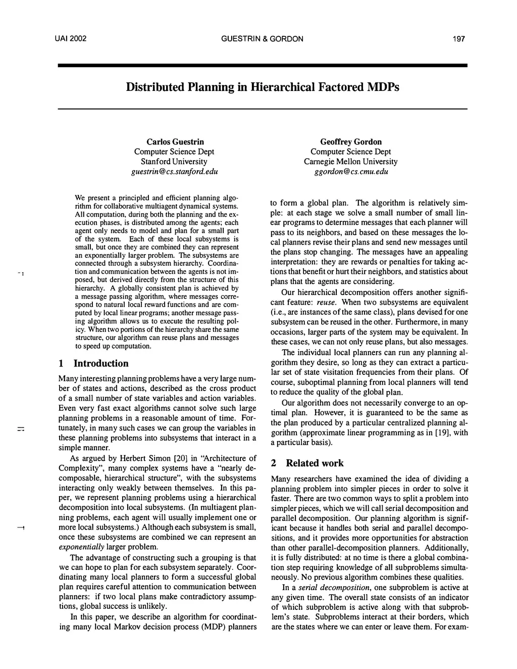 We present a principled and efficient planning algorithm for collaborative multiagent dynamical systems. All computation, during both the planning and the execution phases, is distributed among the agents; each agent only needs to model and plan for a small part of the system. Each of these local subsystems is small, but once they are combined they can represent an exponentially larger problem. The subsystems are connected through a subsystem hierarchy. Coordination and communication between the agents is not imposed, but derived directly from the structure of this hierarchy. A globally consistent plan is achieved by a message passing algorithm, where messages correspond to natural local reward functions and are computed by local linear programs; another message passing algorithm allows us to execute the resulting policy. When two portions of the hierarchy share the same structure, our algorithm can reuse plans and messages to speed up computation.