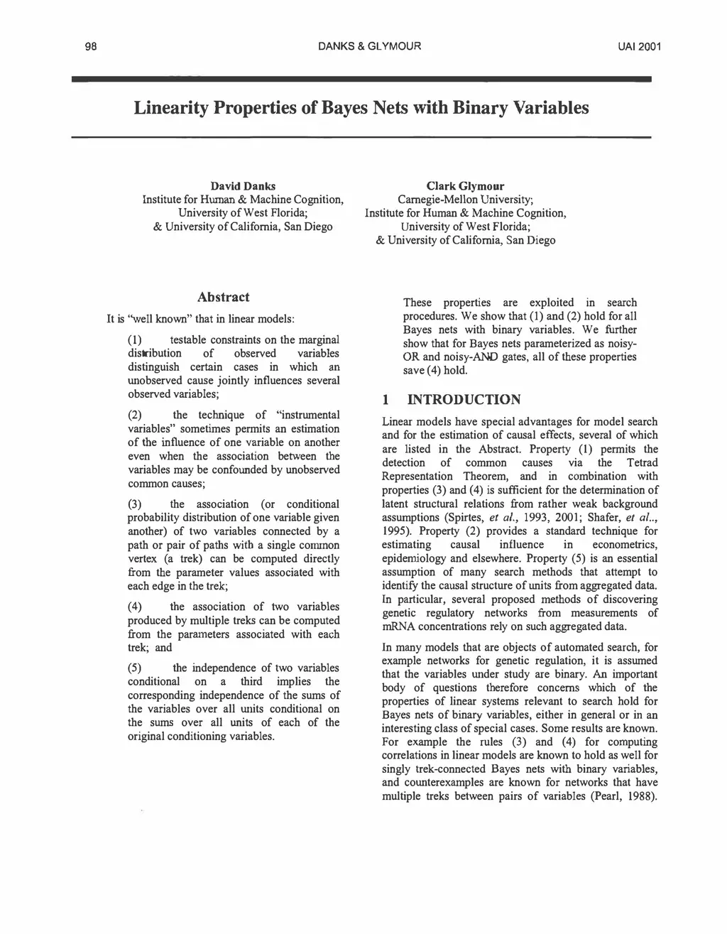 It is "well known" that in linear models: (1) testable constraints on the marginal distribution of observed variables distinguish certain cases in which an unobserved cause jointly influences several observed variables; (2) the technique of "instrumental variables" sometimes permits an estimation of the influence of one variable on another even when the association between the variables may be confounded by unobserved common causes; (3) the association (or conditional probability distribution of one variable given another) of two variables connected by a path or trek can be computed directly from the parameter values associated with each edge in the path or trek; (4) the association of two variables produced by multiple treks can be computed from the parameters associated with each trek; and (5) the independence of two variables conditional on a third implies the corresponding independence of the sums of the variables over all units conditional on the sums over all units of each of the original conditioning variables.These properties are exploited in search procedures. It is also known that properties (2)-(5) do not hold for all Bayes nets with binary variables. We show that (1) holds for all Bayes nets with binary variables and (5) holds for all singly trek-connected Bayes nets of that kind. We further show that all five properties hold for Bayes nets with any DAG and binary variables parameterized with noisy-or and noisy-and gates.