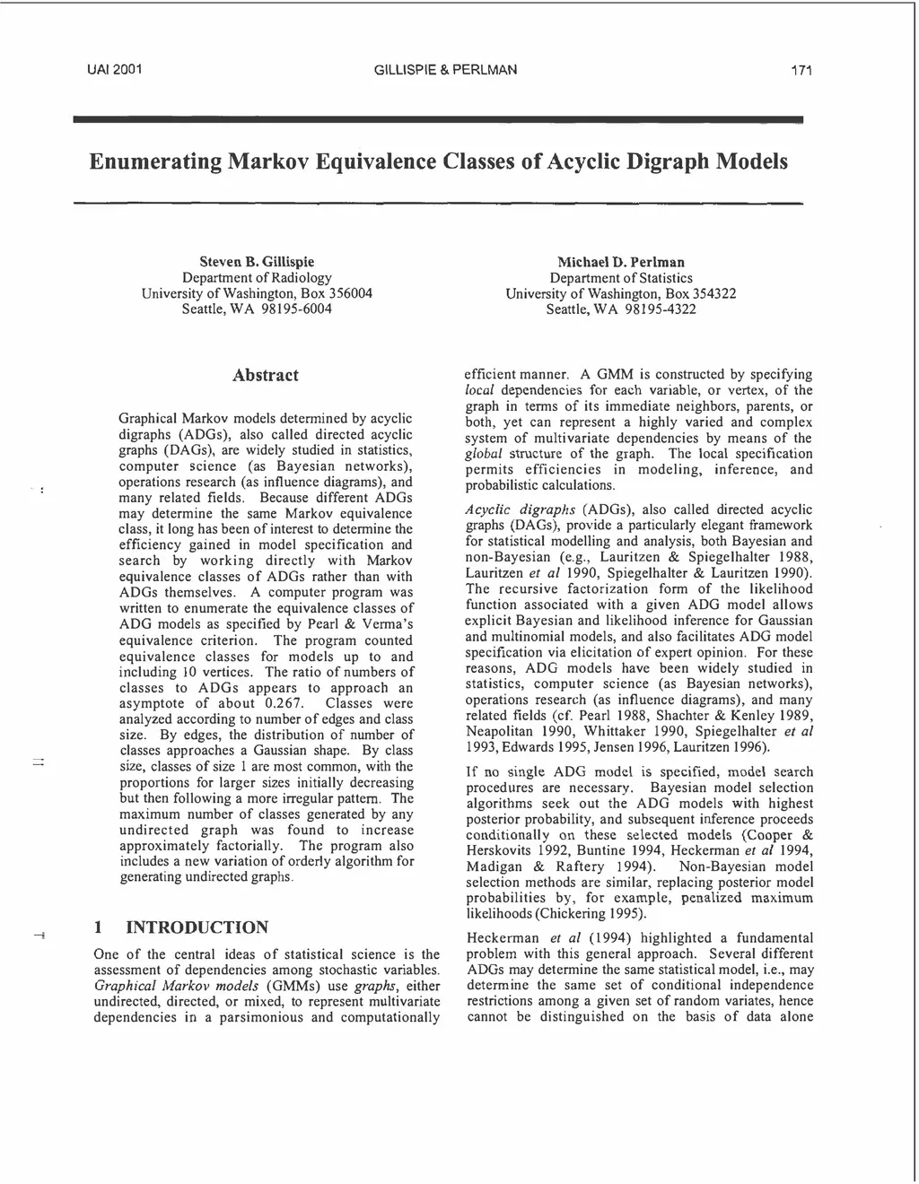 Graphical Markov models determined by acyclic digraphs (ADGs), also called directed acyclic graphs (DAGs), are widely studied in statistics, computer science (as Bayesian networks), operations research (as influence diagrams), and many related fields. Because different ADGs may determine the same Markov equivalence class, it long has been of interest to determine the efficiency gained in model specification and search by working directly with Markov equivalence classes of ADGs rather than with ADGs themselves. A computer program was written to enumerate the equivalence classes of ADG models as specified by Pearl & Verma's equivalence criterion. The program counted equivalence classes for models up to and including 10 vertices. The ratio of number of classes to ADGs appears to approach an asymptote of about 0.267. Classes were analyzed according to number of edges and class size. By edges, the distribution of number of classes approaches a Gaussian shape. By class size, classes of size 1 are most common, with the proportions for larger sizes initially decreasing but then following a more irregular pattern. The maximum number of classes generated by any undirected graph was found to increase approximately factorially. The program also includes a new variation of orderly algorithm for generating undirected graphs.