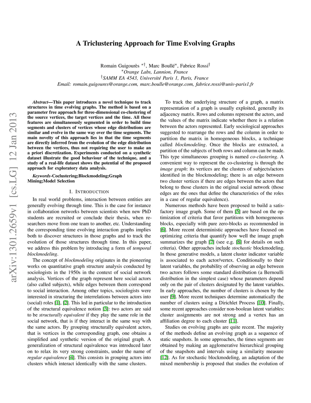 This paper introduces a novel technique to track structures in time evolving graphs. The method is based on a parameter free approach for three-dimensional co-clustering of the source vertices, the target vertices and the time. All these features are simultaneously segmented in order to build time segments and clusters of vertices whose edge distributions are similar and evolve in the same way over the time segments. The main novelty of this approach lies in that the time segments are directly inferred from the evolution of the edge distribution between the vertices, thus not requiring the user to make an a priori discretization. Experiments conducted on a synthetic dataset illustrate the good behaviour of the technique, and a study of a real-life dataset shows the potential of the proposed approach for exploratory data analysis.