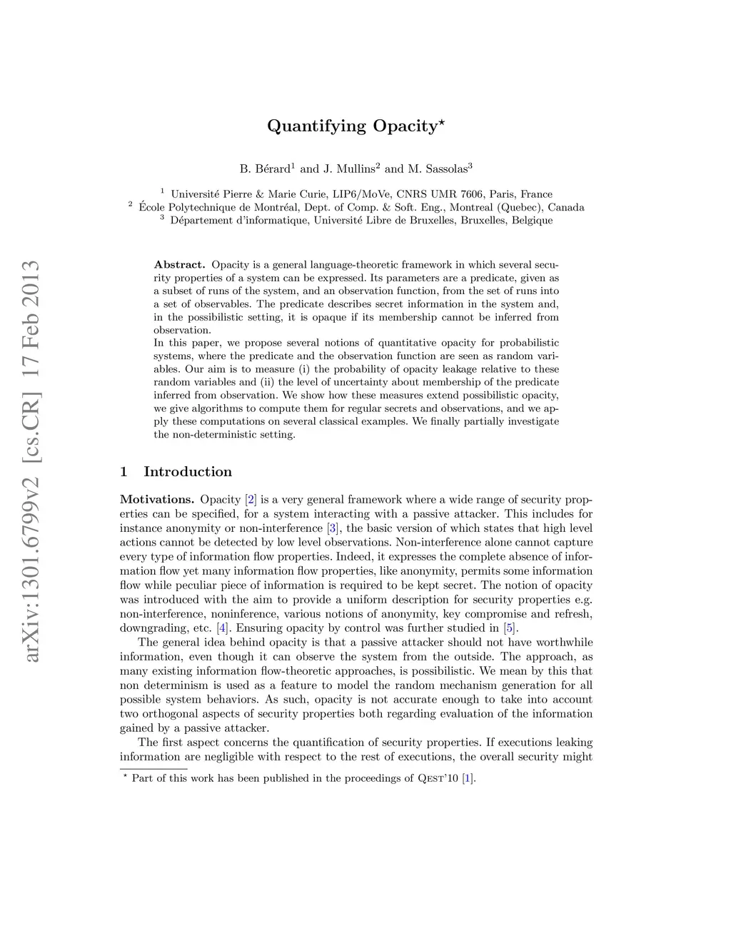Opacity is a general language-theoretic framework in which several security properties of a system can be expressed. Its parameters are a predicate, given as a subset of runs of the system, and an observation function, from the set of runs into a set of observables. The predicate describes secret information in the system and, in the possibilistic setting, it is opaque if its membership cannot be inferred from observation. In this paper, we propose several notions of quantitative opacity for probabilistic systems, where the predicate and the observation function are seen as random variables. Our aim is to measure (i) the probability of opacity leakage relative to these random variables and (ii) the level of uncertainty about membership of the predicate inferred from observation. We show how these measures extend possibilistic opacity, we give algorithms to compute them for regular secrets and observations, and we apply these computations on several classical examples. We finally partially investigate the non-deterministic setting.