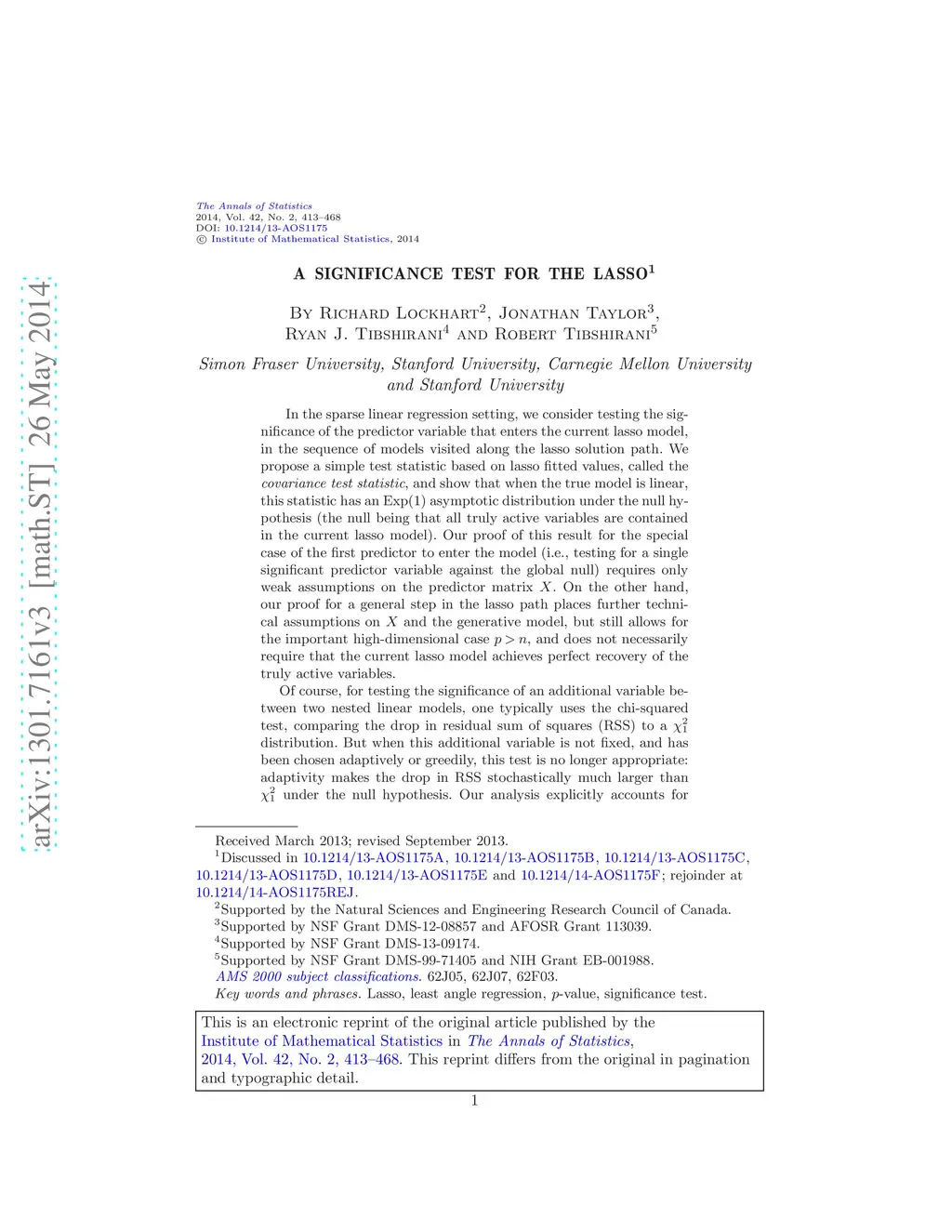 In the sparse linear regression setting, we consider testing the significance of the predictor variable that enters the current lasso model, in the sequence of models visited along the lasso solution path. We propose a simple test statistic based on lasso fitted values, called the covariance test statistic, and show that when the true model is linear, this statistic has an asymptotic distribution under the null hypothesis (the null being that all truly active variables are contained in the current lasso model). Our proof of this result for the special case of the first predictor to enter the model (i.e., testing for a single significant predictor variable against the global null) requires only weak assumptions on the predictor matrix . On the other hand, our proof for a general step in the lasso path places further technical assumptions on and the generative model, but still allows for the important high-dimensional case , and does not necessarily require that the current lasso model achieves perfect recovery of the truly active variables. Of course, for testing the significance of an additional variable between two nested linear models, one typically uses the chi-squared test, comparing the drop in residual sum of squares (RSS) to a distribution. But when this additional variable is not fixed, and has been chosen adaptively or greedily, this test is no longer appropriate: adaptivity makes the drop in RSS stochastically much larger than under the null hypothesis. Our analysis explicitly accounts for adaptivity, as it must, since the lasso builds an adaptive sequence of linear models as the tuning parameter decreases. In this analysis, shrinkage plays a key role: though additional variables are chosen adaptively, the coefficients of lasso active variables are shrunken due to the penalty. Therefore, the test statistic (which is based on lasso fitted values) is in a sense balanced by these two opposing properties - adaptivity and shrinkage - and its null distribution is tractable and asymptotically .
