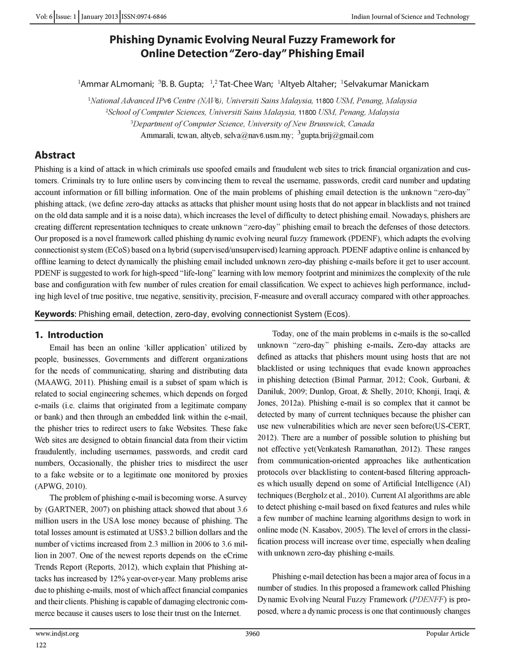 Phishing is a kind of attack in which criminals use spoofed emails and fraudulent web sites to trick financial organization and customers. Criminals try to lure online users by convincing them to reveal the username, passwords, credit card number and updating account information or fill billing information.