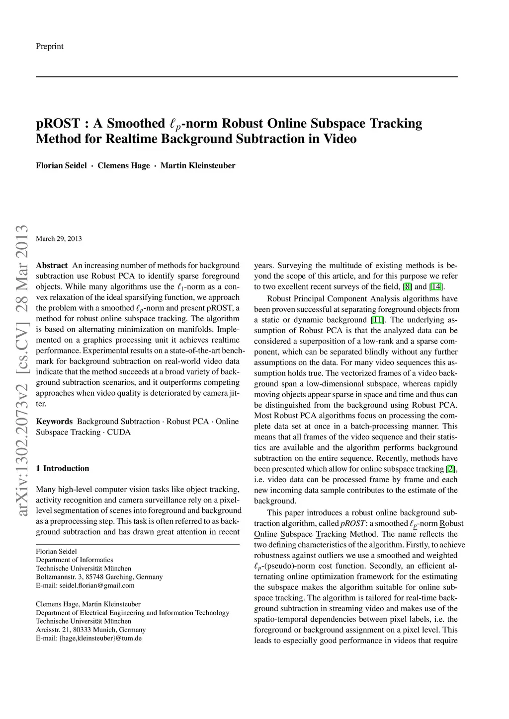 An increasing number of methods for background subtraction use Robust PCA to identify sparse foreground objects. While many algorithms use the L1-norm as a convex relaxation of the ideal sparsifying function, we approach the problem with a smoothed Lp-norm and present pROST, a method for robust online subspace tracking. The algorithm is based on alternating minimization on manifolds. Implemented on a graphics processing unit it achieves realtime performance. Experimental results on a state-of-the-art benchmark for background subtraction on real-world video data indicate that the method succeeds at a broad variety of background subtraction scenarios, and it outperforms competing approaches when video quality is deteriorated by camera jitter.
