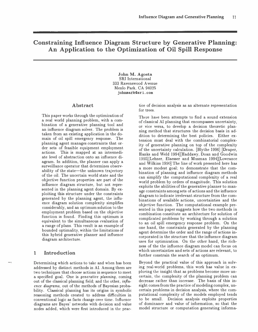 This paper works through the optimization of a real world planning problem, with a combination of a generative planning tool and an influence diagram solver. The problem is taken from an existing application in the domain of oil spill emergency response. The planning agent manages constraints that order sets of feasible equipment employment actions. This is mapped at an intermediate level of abstraction onto an influence diagram. In addition, the planner can apply a surveillance operator that determines observability of the state---the unknown trajectory of the oil. The uncertain world state and the objective function properties are part of the influence diagram structure, but not represented in the planning agent domain. By exploiting this structure under the constraints generated by the planning agent, the influence diagram solution complexity simplifies considerably, and an optimum solution to the employment problem based on the objective function is found. Finding this optimum is equivalent to the simultaneous evaluation of a range of plans. This result is an example of bounded optimality, within the limitations of this hybrid generative planner and influence diagram architecture.