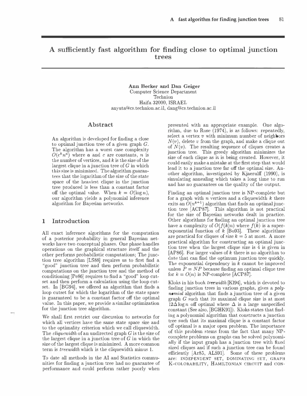 An algorithm is developed for finding a close to optimal junction tree of a given graph G. The algorithm has a worst case complexity O(c^k n^a) where a and c are constants, n is the number of vertices, and k is the size of the largest clique in a junction tree of G in which this size is minimized. The algorithm guarantees that the logarithm of the size of the state space of the heaviest clique in the junction tree produced is less than a constant factor off the optimal value. When k = O(log n), our algorithm yields a polynomial inference algorithm for Bayesian networks.
