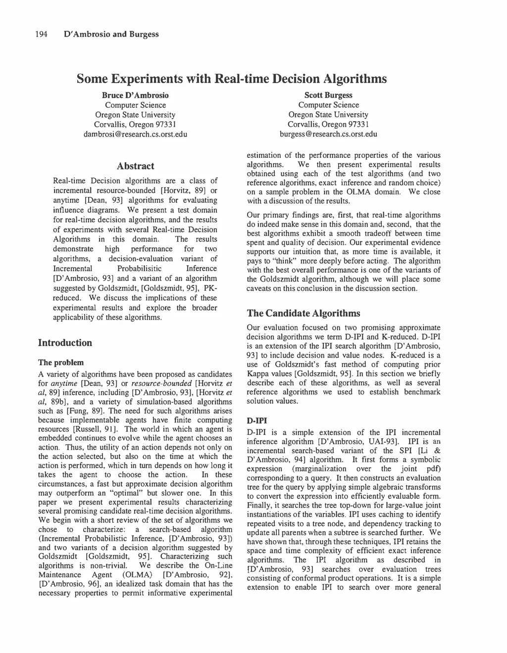 Real-time Decision algorithms are a class of incremental resource-bounded [Horvitz, 89] or anytime [Dean, 93] algorithms for evaluating influence diagrams. We present a test domain for real-time decision algorithms, and the results of experiments with several Real-time Decision Algorithms in this domain. The results demonstrate high performance for two algorithms, a decision-evaluation variant of Incremental Probabilisitic Inference [DÁmbrosio 93] and a variant of an algorithm suggested by Goldszmidt, [Goldszmidt, 95], PK-reduced. We discuss the implications of these experimental results and explore the broader applicability of these algorithms.