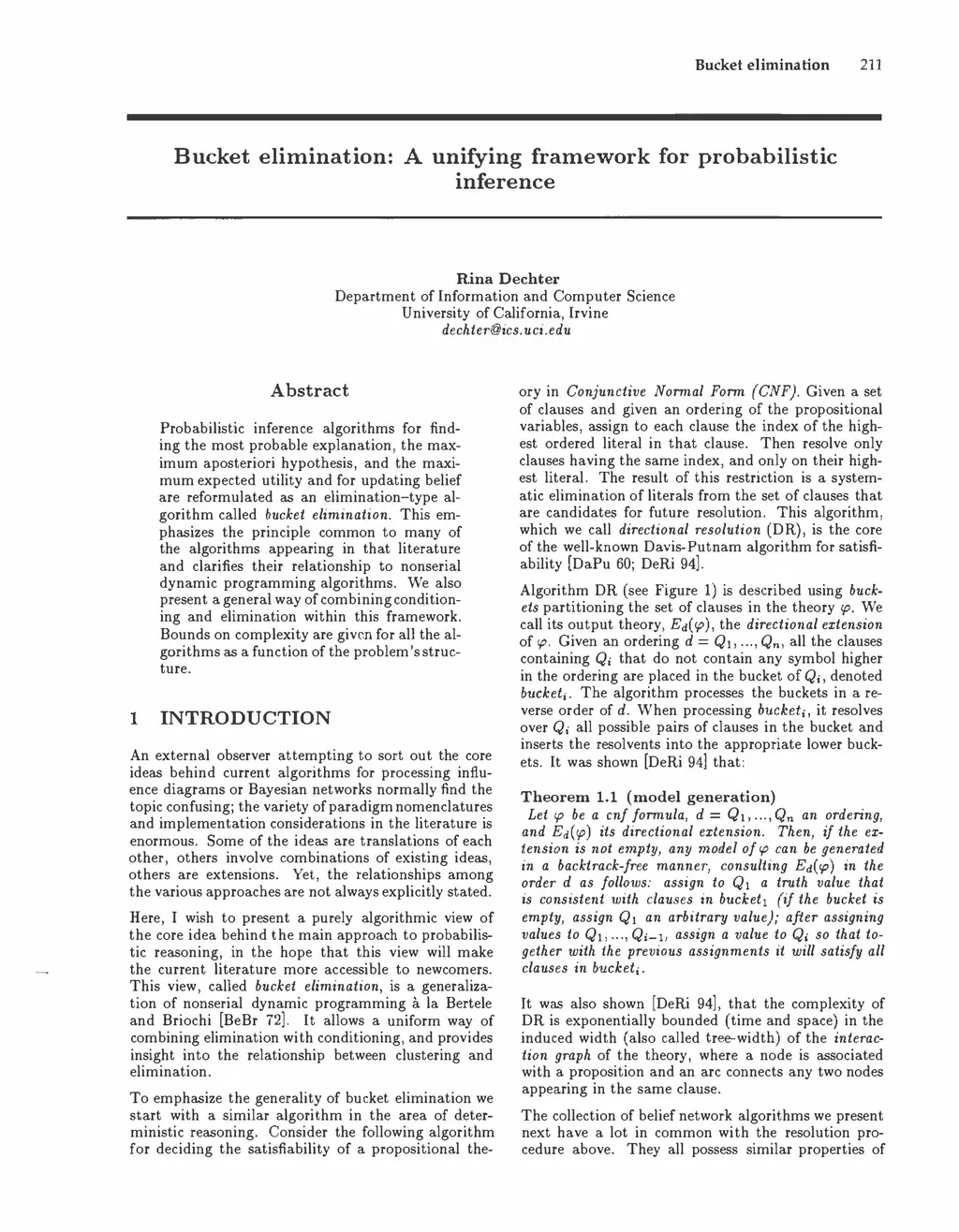 Probabilistic inference algorithms for finding the most probable explanation, the maximum aposteriori hypothesis, and the maximum expected utility and for updating belief are reformulated as an elimination--type algorithm called bucket elimination. This emphasizes the principle common to many of the algorithms appearing in that literature and clarifies their relationship to nonserial dynamic programming algorithms. We also present a general way of combining conditioning and elimination within this framework. Bounds on complexity are given for all the algorithms as a function of the problem's structure.