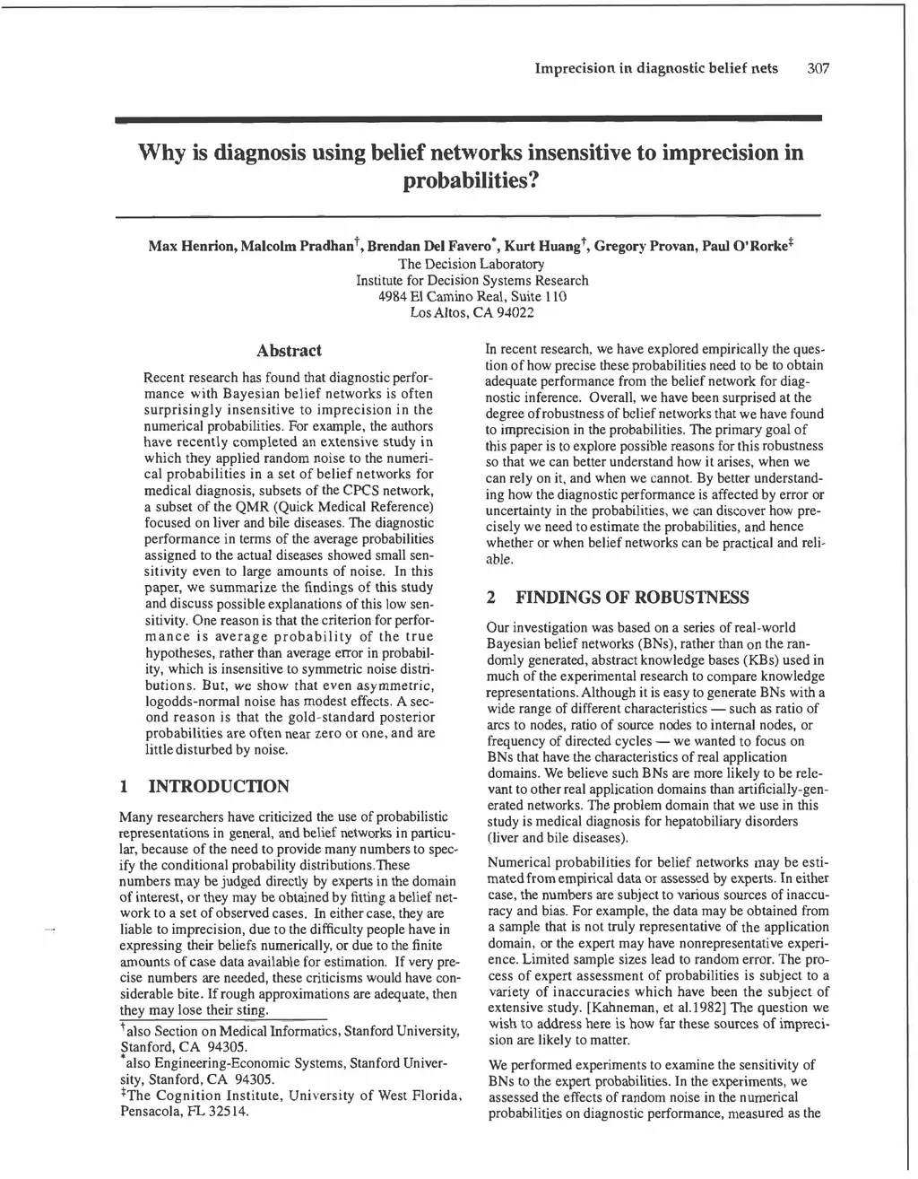 Recent research has found that diagnostic performance with Bayesian belief networks is often surprisingly insensitive to imprecision in the numerical probabilities. For example, the authors have recently completed an extensive study in which they applied random noise to the numerical probabilities in a set of belief networks for medical diagnosis, subsets of the CPCS network, a subset of the QMR (Quick Medical Reference) focused on liver and bile diseases. The diagnostic performance in terms of the average probabilities assigned to the actual diseases showed small sensitivity even to large amounts of noise. In this paper, we summarize the findings of this study and discuss possible explanations of this low sensitivity. One reason is that the criterion for performance is average probability of the true hypotheses, rather than average error in probability, which is insensitive to symmetric noise distributions. But, we show that even asymmetric, logodds-normal noise has modest effects. A second reason is that the gold-standard posterior probabilities are often near zero or one, and are little disturbed by noise.