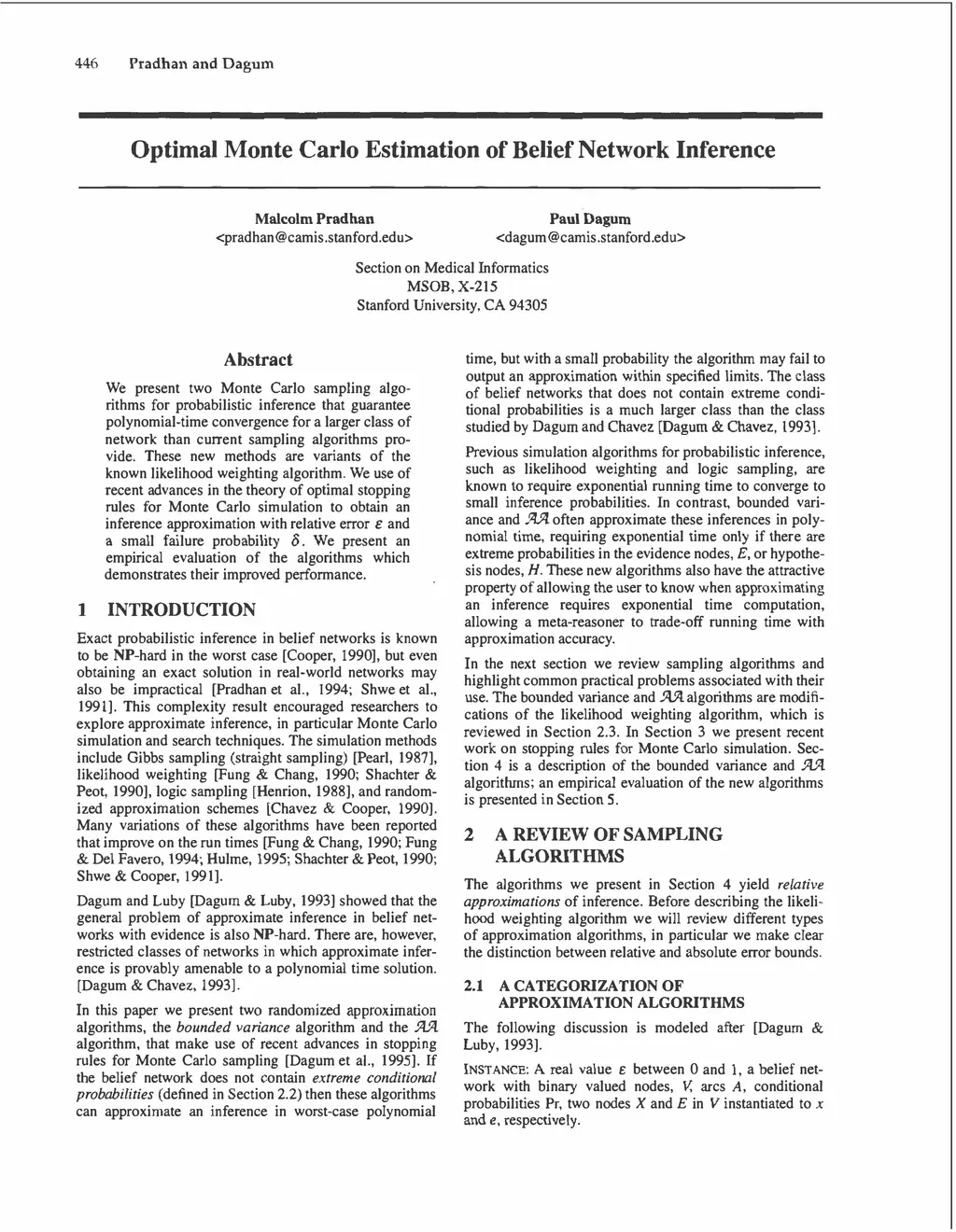 We present two Monte Carlo sampling algorithms for probabilistic inference that guarantee polynomial-time convergence for a larger class of network than current sampling algorithms provide. These new methods are variants of the known likelihood weighting algorithm. We use of recent advances in the theory of optimal stopping rules for Monte Carlo simulation to obtain an inference approximation with relative error epsilon and a small failure probability delta. We present an empirical evaluation of the algorithms which demonstrates their improved performance.