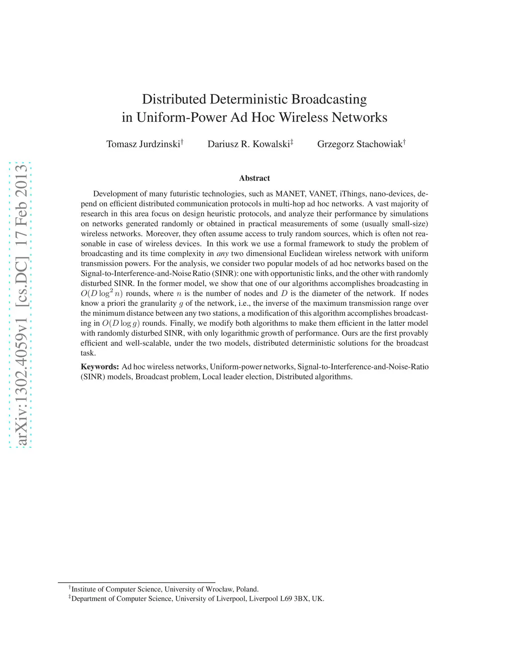 Development of many futuristic technologies, such as MANET, VANET, iThings, nano-devices, depend on efficient distributed communication protocols in multi-hop ad hoc networks. A vast majority of research in this area focus on design heuristic protocols, and analyze their performance by simulations on networks generated randomly or obtained in practical measurements of some (usually small-size) wireless networks. %some library. Moreover, they often assume access to truly random sources, which is often not reasonable in case of wireless devices. In this work we use a formal framework to study the problem of broadcasting and its time complexity in any two dimensional Euclidean wireless network with uniform transmission powers. For the analysis, we consider two popular models of ad hoc networks based on the Signal-to-Interference-and-Noise Ratio (SINR): one with opportunistic links, and the other with randomly disturbed SINR. In the former model, we show that one of our algorithms accomplishes broadcasting in rounds, where is the number of nodes and is the diameter of the network. If nodes know a priori the granularity of the network, i.e., the inverse of the maximum transmission range over the minimum distance between any two stations, a modification of this algorithm accomplishes broadcasting in rounds. Finally, we modify both algorithms to make them efficient in the latter model with randomly disturbed SINR, with only logarithmic growth of performance. Ours are the first provably efficient and well-scalable, under the two models, distributed deterministic solutions for the broadcast task.
