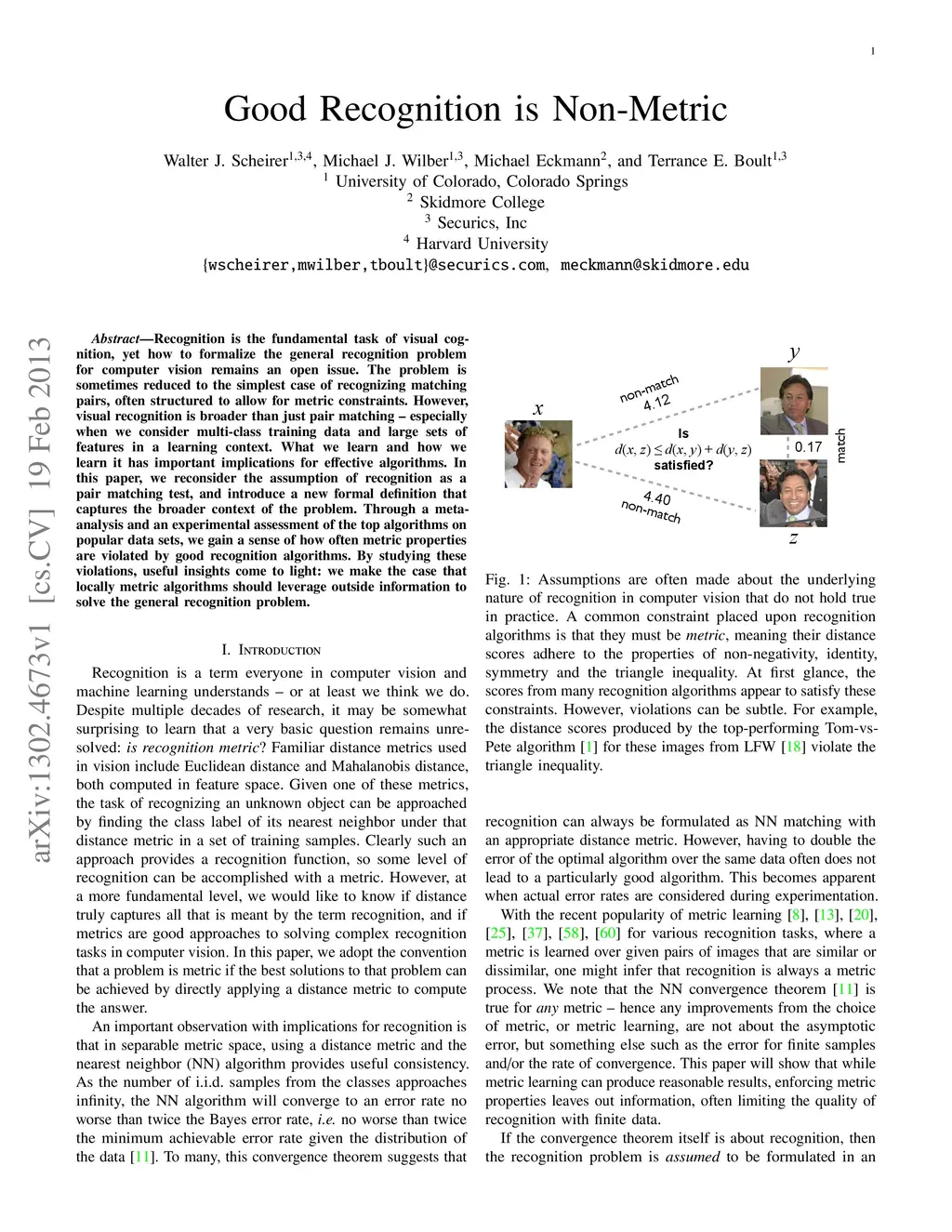 Recognition is the fundamental task of visual cognition, yet how to formalize the general recognition problem for computer vision remains an open issue. The problem is sometimes reduced to the simplest case of recognizing matching pairs, often structured to allow for metric constraints. However, visual recognition is broader than just pair matching -- especially when we consider multi-class training data and large sets of features in a learning context. What we learn and how we learn it has important implications for effective algorithms. In this paper, we reconsider the assumption of recognition as a pair matching test, and introduce a new formal definition that captures the broader context of the problem. Through a meta-analysis and an experimental assessment of the top algorithms on popular data sets, we gain a sense of how often metric properties are violated by good recognition algorithms. By studying these violations, useful insights come to light: we make the case that locally metric algorithms should leverage outside information to solve the general recognition problem.