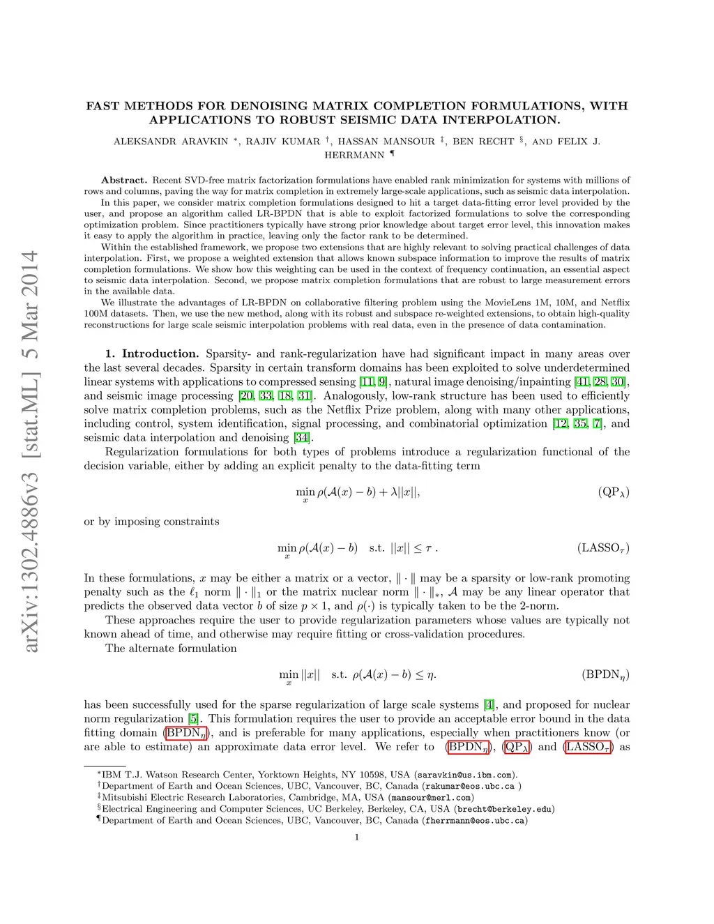 Fast methods for denoising matrix completion formulations, with