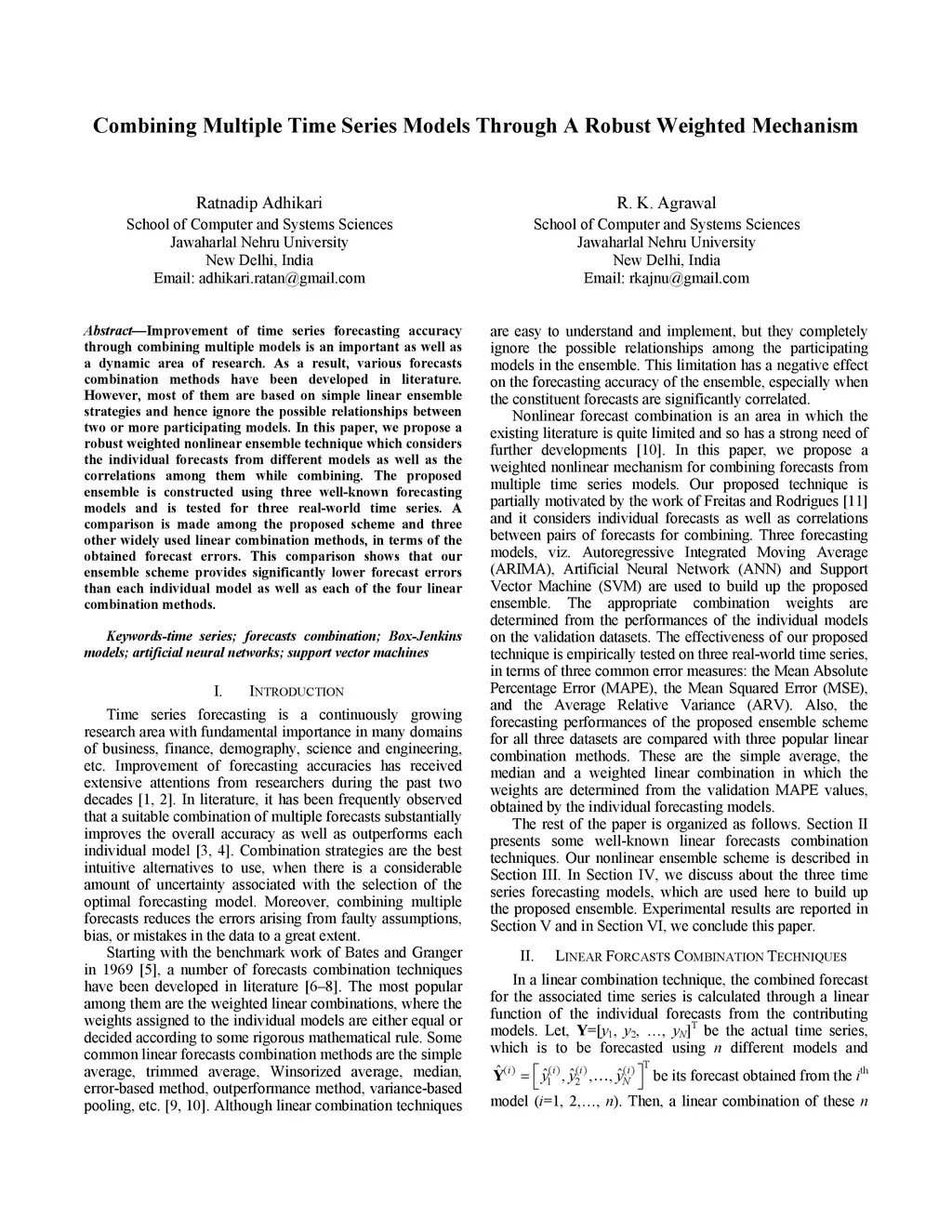 Improvement of time series forecasting accuracy through combining multiple models is an important as well as a dynamic area of research. As a result, various forecasts combination methods have been developed in literature. However, most of them are based on simple linear ensemble strategies and hence ignore the possible relationships between two or more participating models. In this paper, we propose a robust weighted nonlinear ensemble technique which considers the individual forecasts from different models as well as the correlations among them while combining. The proposed ensemble is constructed using three well-known forecasting models and is tested for three real-world time series. A comparison is made among the proposed scheme and three other widely used linear combination methods, in terms of the obtained forecast errors. This comparison shows that our ensemble scheme provides significantly lower forecast errors than each individual model as well as each of the four linear combination methods.