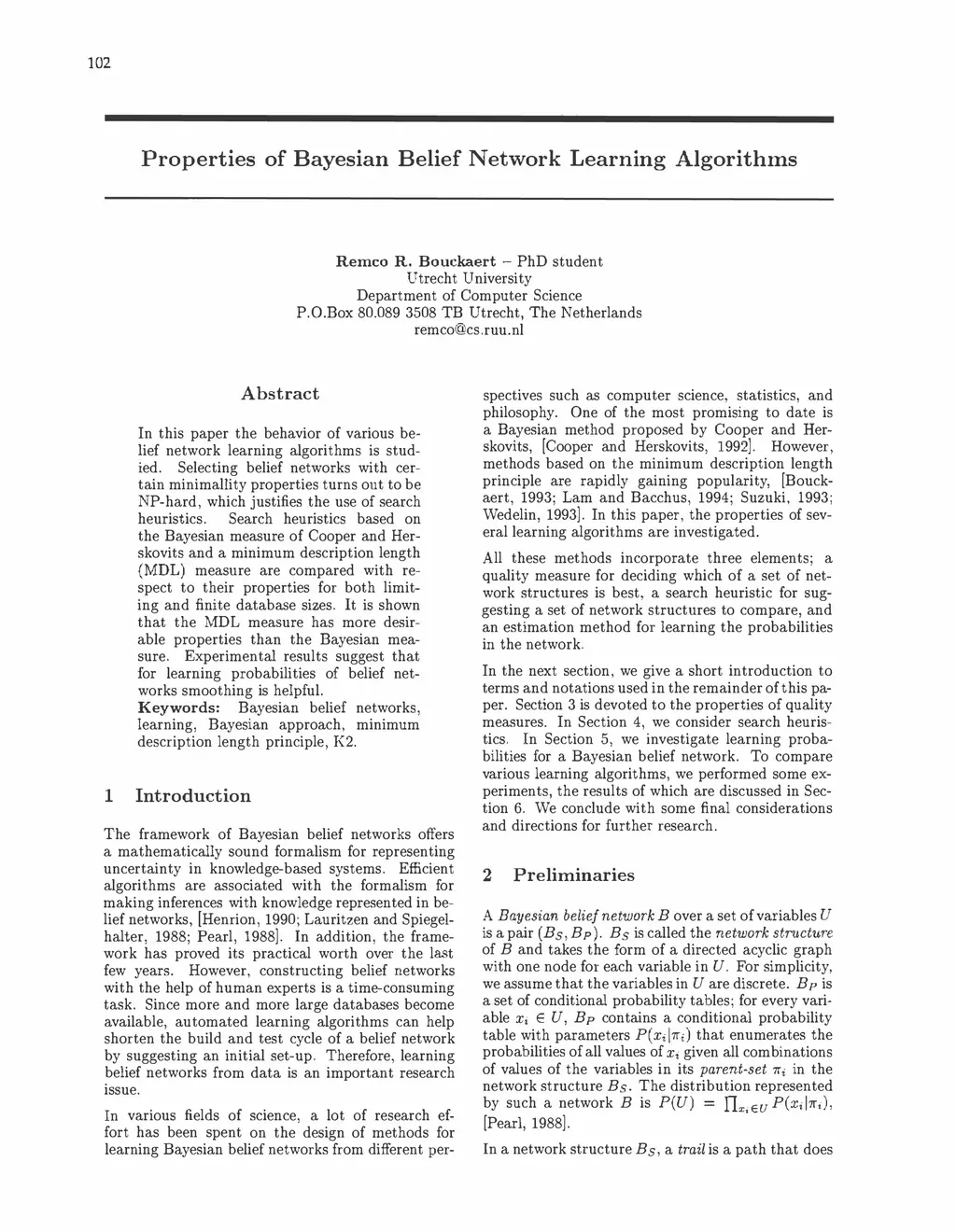 Bayesian belief network learning algorithms have three basic components: a measure of a network structure and a database, a search heuristic that chooses network structures to be considered, and a method of estimating the probability tables from the database. This paper contributes to all these three topics. The behavior of the Bayesian measure of Cooper and Herskovits and a minimum description length (MDL) measure are compared with respect to their properties for both limiting size and finite size databases. It is shown that the MDL measure has more desirable properties than the Bayesian measure when a distribution is to be learned. It is shown that selecting belief networks with certain minimallity properties is NP-hard. This result justifies the use of search heuristics instead of exact algorithms for choosing network structures to be considered. In some cases, a collection of belief networks can be represented by a single belief network which leads to a new kind of probability table estimation called smoothing. We argue that smoothing can be efficiently implemented by incorporating it in the search heuristic. Experimental results suggest that for learning probabilities of belief networks smoothing is helpful.