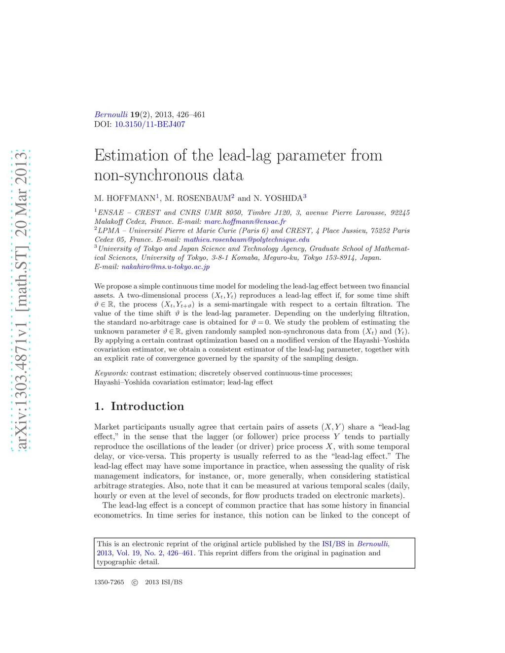 We propose a simple continuous time model for modeling the lead-lag effect between two financial assets. A two-dimensional process reproduces a lead-lag effect if, for some time shift , the process is a semi-martingale with respect to a certain filtration. The value of the time shift is the lead-lag parameter. Depending on the underlying filtration, the standard no-arbitrage case is obtained for . We study the problem of estimating the unknown parameter , given randomly sampled non-synchronous data from and . By applying a certain contrast optimization based on a modified version of the Hayashi-Yoshida covariation estimator, we obtain a consistent estimator of the lead-lag parameter, together with an explicit rate of convergence governed by the sparsity of the sampling design.