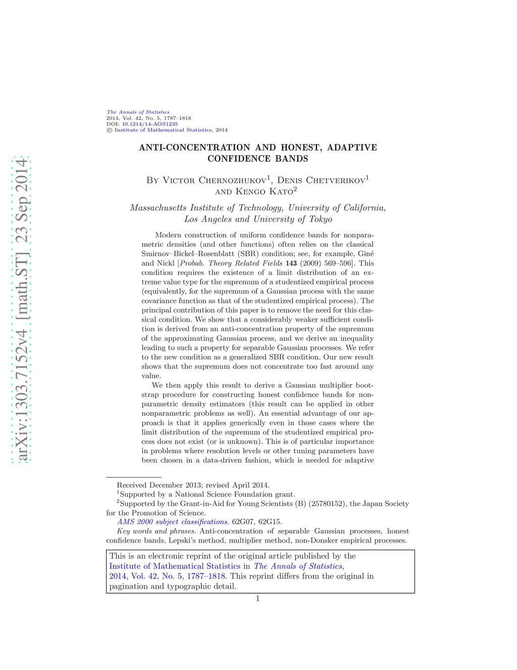 Modern construction of uniform confidence bands for nonparametric densities (and other functions) often relies on the classical Smirnov-Bickel-Rosenblatt (SBR) condition; see, for example, Gin\'{e} and Nickl [Probab. Theory Related Fields 143 (2009) 569-596]. This condition requires the existence of a limit distribution of an extreme value type for the supremum of a studentized empirical process (equivalently, for the supremum of a Gaussian process with the same covariance function as that of the studentized empirical process). The principal contribution of this paper is to remove the need for this classical condition. We show that a considerably weaker sufficient condition is derived from an anti-concentration property of the supremum of the approximating Gaussian process, and we derive an inequality leading to such a property for separable Gaussian processes. We refer to the new condition as a generalized SBR condition. Our new result shows that the supremum does not concentrate too fast around any value. We then apply this result to derive a Gaussian multiplier bootstrap procedure for constructing honest confidence bands for nonparametric density estimators (this result can be applied in other nonparametric problems as well). An essential advantage of our approach is that it applies generically even in those cases where the limit distribution of the supremum of the studentized empirical process does not exist (or is unknown). This is of particular importance in problems where resolution levels or other tuning parameters have been chosen in a data-driven fashion, which is needed for adaptive constructions of the confidence bands. Finally, of independent interest is our introduction of a new, practical version of Lepski's method, which computes the optimal, nonconservative resolution levels via a Gaussian multiplier bootstrap method.