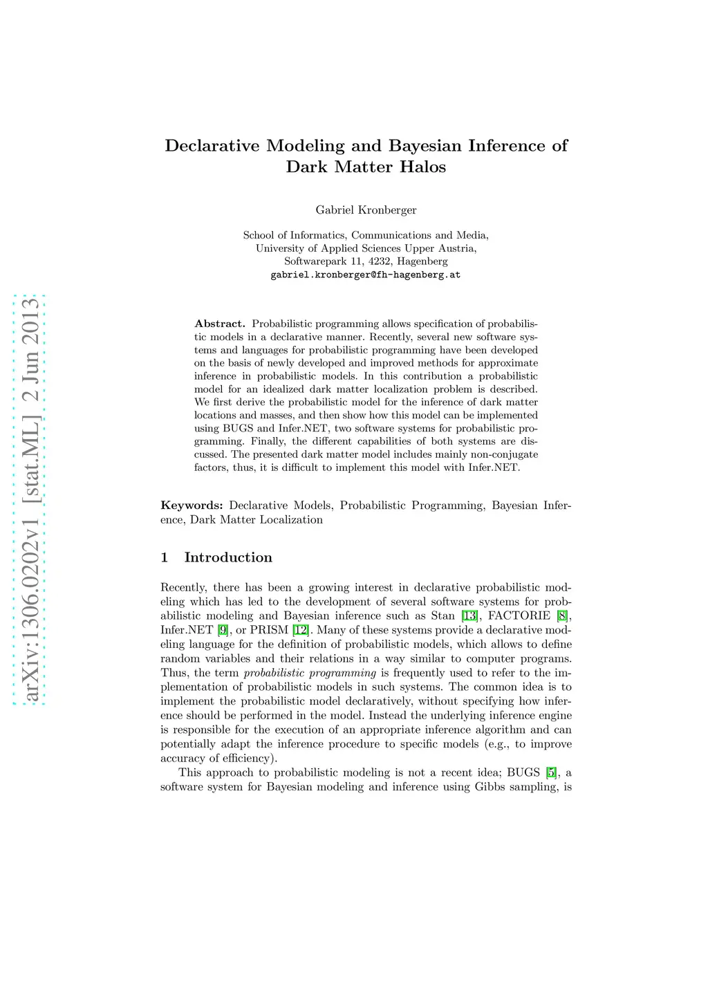 Probabilistic programming allows specification of probabilistic models in a declarative manner. Recently, several new software systems and languages for probabilistic programming have been developed on the basis of newly developed and improved methods for approximate inference in probabilistic models. In this contribution a probabilistic model for an idealized dark matter localization problem is described. We first derive the probabilistic model for the inference of dark matter locations and masses, and then show how this model can be implemented using BUGS and Infer.NET, two software systems for probabilistic programming. Finally, the different capabilities of both systems are discussed. The presented dark matter model includes mainly non-conjugate factors, thus, it is difficult to implement this model with Infer.NET.