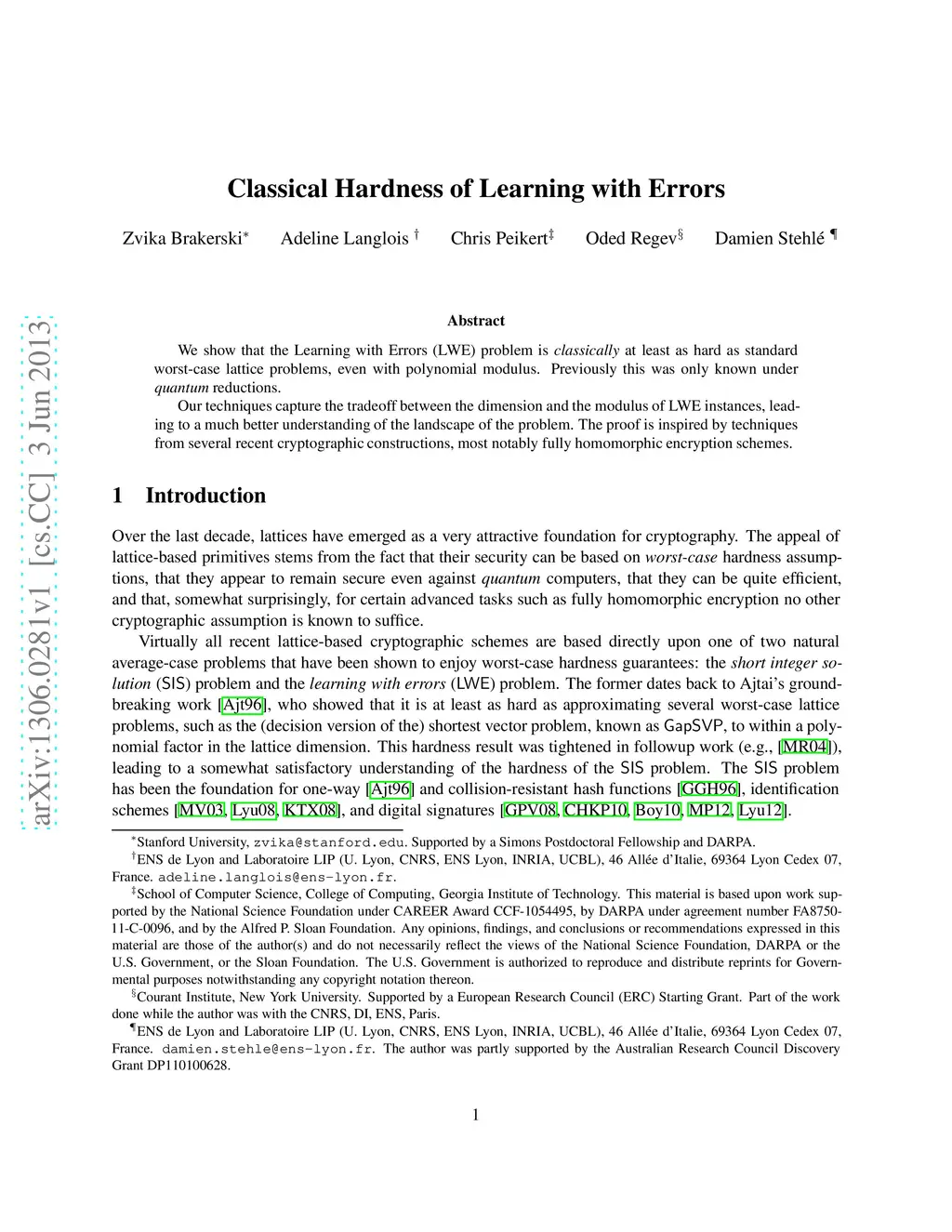 We show that the Learning with Errors (LWE) problem is classically at least as hard as standard worst-case lattice problems, even with polynomial modulus. Previously this was only known under quantum reductions. Our techniques capture the tradeoff between the dimension and the modulus of LWE instances, leading to a much better understanding of the landscape of the problem. The proof is inspired by techniques from several recent cryptographic constructions, most notably fully homomorphic encryption schemes.