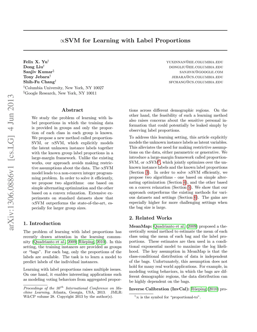 We study the problem of learning with label proportions in which the training data is provided in groups and only the proportion of each class in each group is known. We propose a new method called proportion-SVM, or SVM, which explicitly models the latent unknown instance labels together with the known group label proportions in a large-margin framework. Unlike the existing works, our approach avoids making restrictive assumptions about the data. The SVM model leads to a non-convex integer programming problem. In order to solve it efficiently, we propose two algorithms: one based on simple alternating optimization and the other based on a convex relaxation. Extensive experiments on standard datasets show that SVM outperforms the state-of-the-art, especially for larger group sizes.