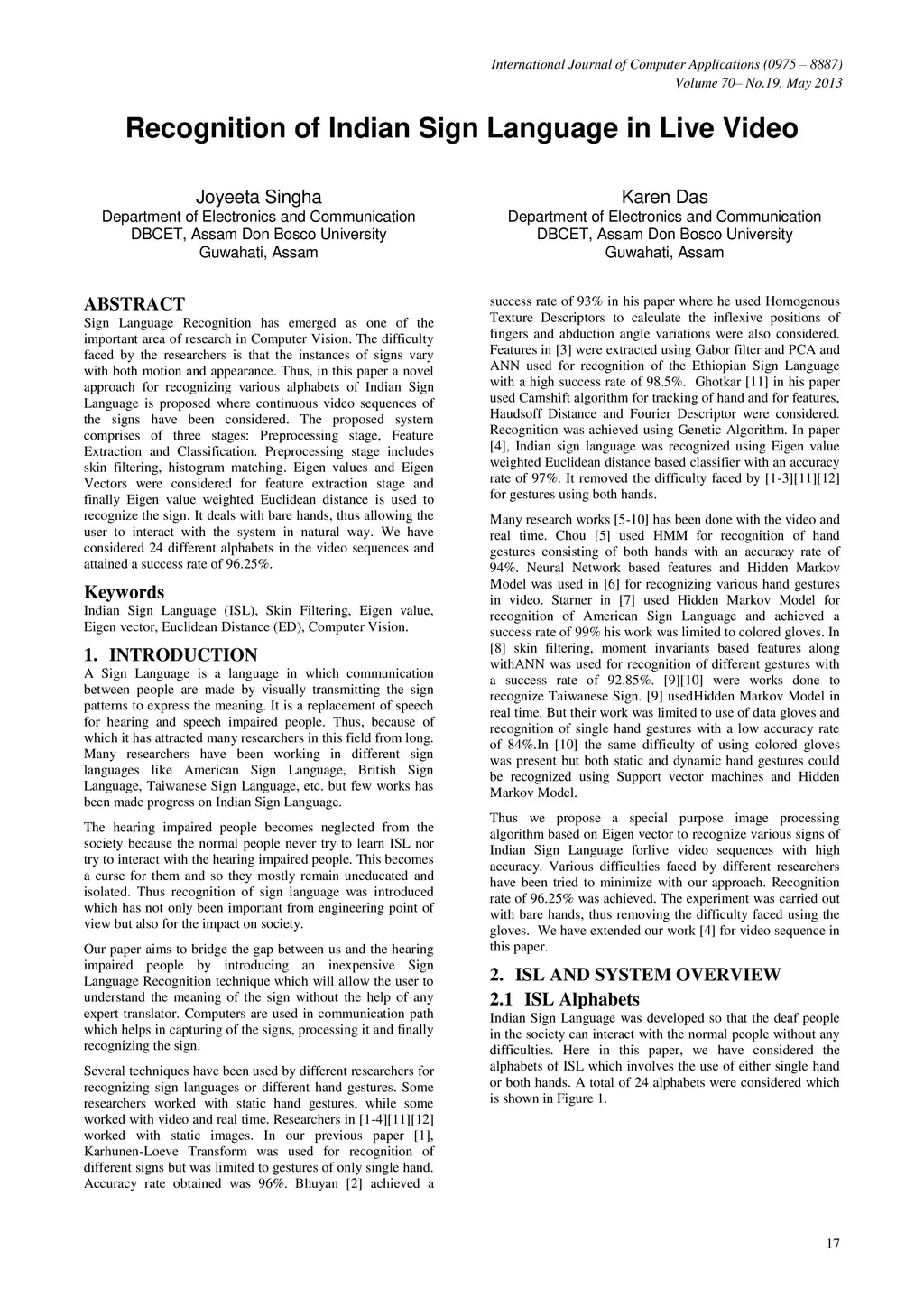 Sign Language Recognition has emerged as one of the important area of research in Computer Vision. The difficulty faced by the researchers is that the instances of signs vary with both motion and appearance. Thus, in this paper a novel approach for recognizing various alphabets of Indian Sign Language is proposed where continuous video sequences of the signs have been considered. The proposed system comprises of three stages: Preprocessing stage, Feature Extraction and Classification. Preprocessing stage includes skin filtering, histogram matching. Eigen values and Eigen Vectors were considered for feature extraction stage and finally Eigen value weighted Euclidean distance is used to recognize the sign. It deals with bare hands, thus allowing the user to interact with the system in natural way. We have considered 24 different alphabets in the video sequences and attained a success rate of 96.25%.