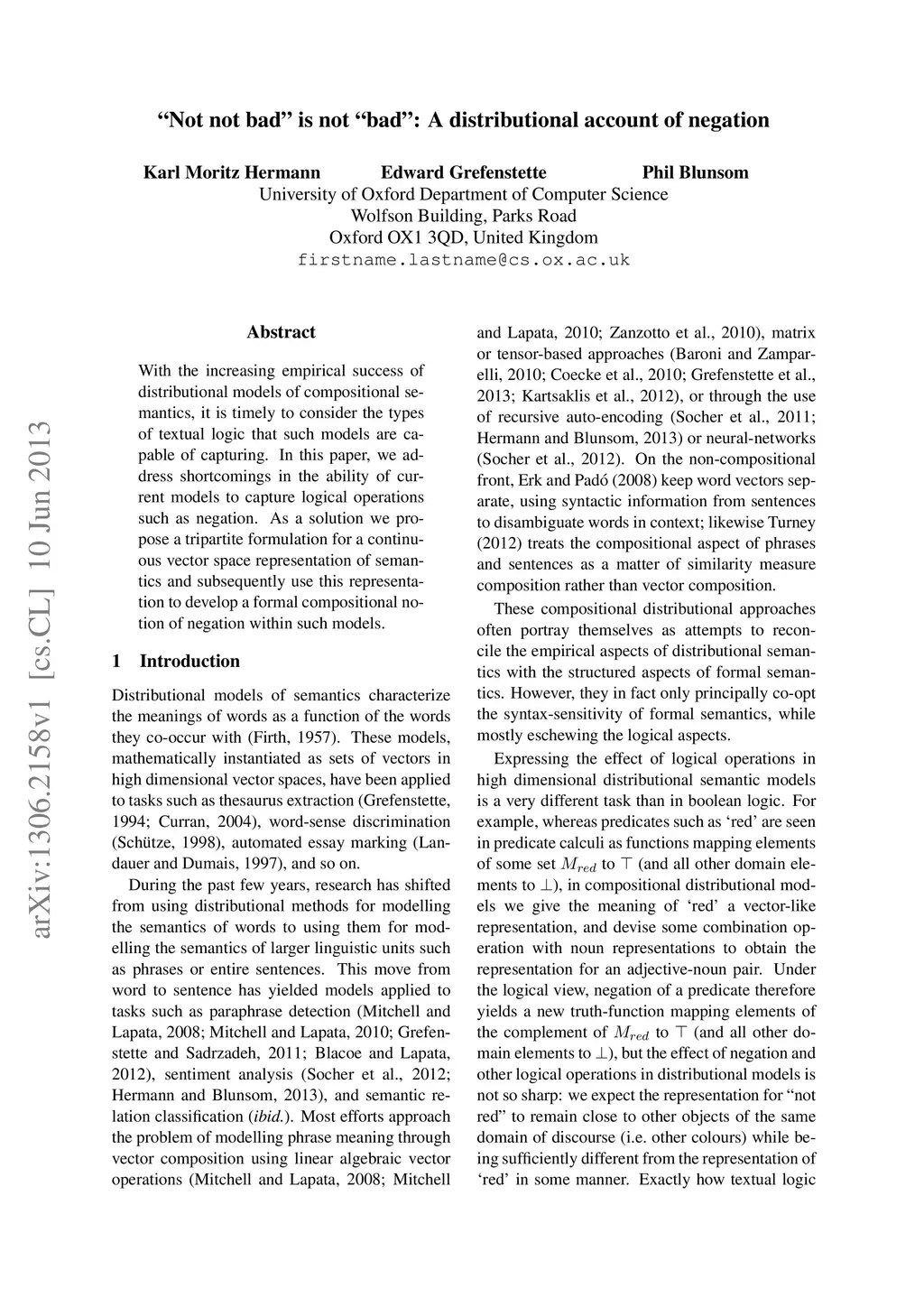With the increasing empirical success of distributional models of compositional semantics, it is timely to consider the types of textual logic that such models are capable of capturing. In this paper, we address shortcomings in the ability of current models to capture logical operations such as negation. As a solution we propose a tripartite formulation for a continuous vector space representation of semantics and subsequently use this representation to develop a formal compositional notion of negation within such models.