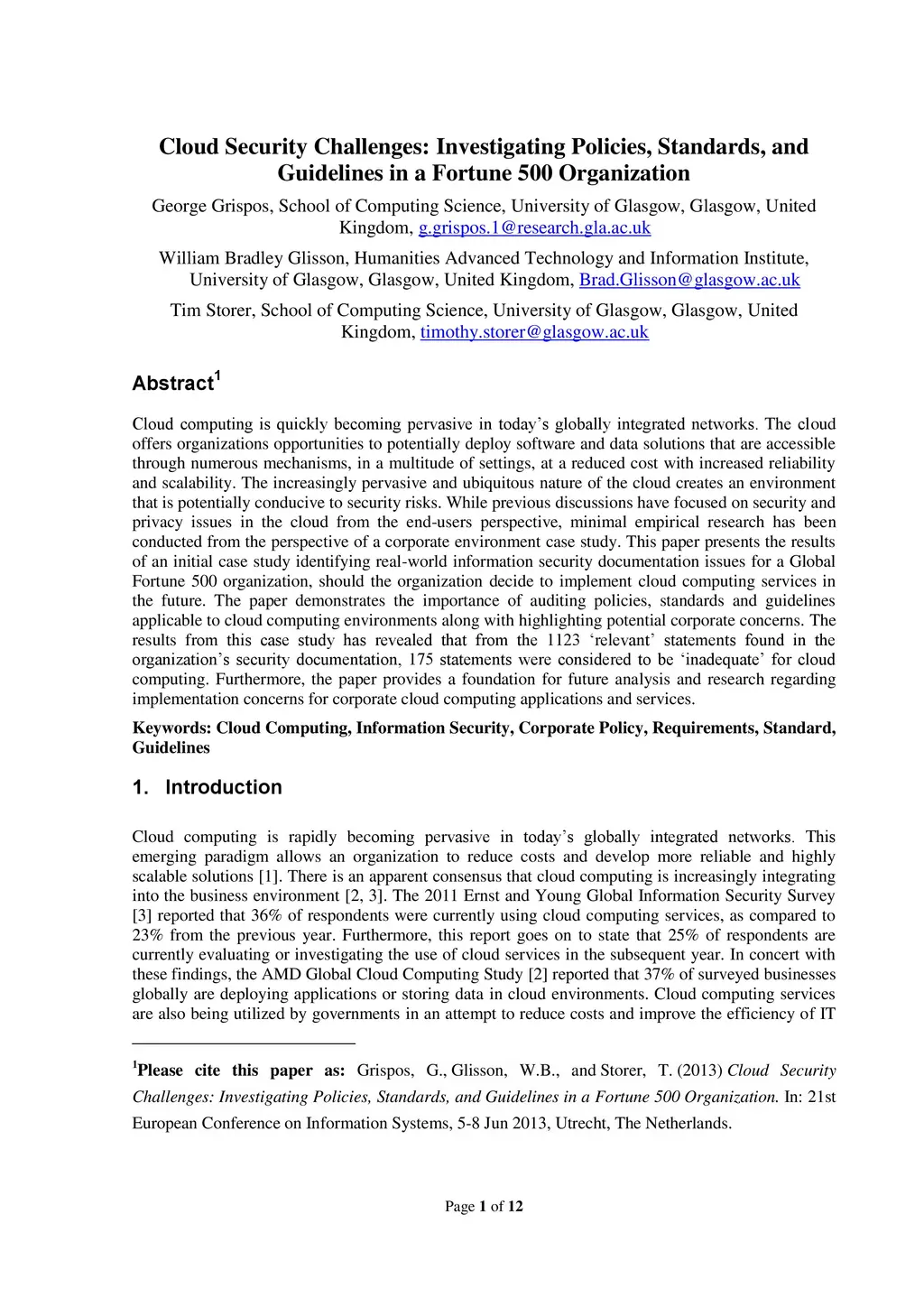 Cloud computing is quickly becoming pervasive in today's globally integrated networks. The cloud offers organizations opportunities to potentially deploy software and data solutions that are accessible through numerous mechanisms, in a multitude of settings, at a reduced cost with increased reliability and scalability. The increasingly pervasive and ubiquitous nature of the cloud creates an environment that is potentially conducive to security risks. While previous discussions have focused on security and privacy issues in the cloud from the end-users perspective, minimal empirical research has been conducted from the perspective of a corporate environment case study. This paper presents the results of an initial case study identifying real-world information security documentation issues for a Global Fortune 500 organization, should the organization decide to implement cloud computing services in the future. The paper demonstrates the importance of auditing policies, standards and guidelines applicable to cloud computing environments along with highlighting potential corporate concerns. The results from this case study has revealed that from the 1123 'relevant' statements found in the organization's security documentation, 175 statements were considered to be ínadequate' for cloud computing. Furthermore, the paper provides a foundation for future analysis and research regarding implementation concerns for corporate cloud computing applications and services