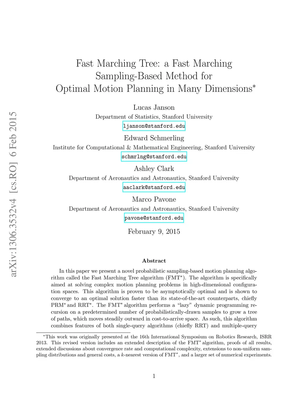 In this paper we present a novel probabilistic sampling-based motion planning algorithm called the Fast Marching Tree algorithm (FMT*). The algorithm is specifically aimed at solving complex motion planning problems in high-dimensional configuration spaces. This algorithm is proven to be asymptotically optimal and is shown to converge to an optimal solution faster than its state-of-the-art counterparts, chiefly PRM* and RRT*. The FMT* algorithm performs a "lazy" dynamic programming recursion on a predetermined number of probabilistically-drawn samples to grow a tree of paths, which moves steadily outward in cost-to-arrive space. As a departure from previous analysis approaches that are based on the notion of almost sure convergence, the FMT* algorithm is analyzed under the notion of convergence in probability: the extra mathematical flexibility of this approach allows for convergence rate bounds--the first in the field of optimal sampling-based motion planning. Specifically, for a certain selection of tuning parameters and configuration spaces, we obtain a convergence rate bound of order , where is the number of sampled points, is the dimension of the configuration space, and is an arbitrarily small constant. We go on to demonstrate asymptotic optimality for a number of variations on FMT*, namely when the configuration space is sampled non-uniformly, when the cost is not arc length, and when connections are made based on the number of nearest neighbors instead of a fixed connection radius. Numerical experiments over a range of dimensions and obstacle configurations confirm our theoretical and heuristic arguments by showing that FMT*, for a given execution time, returns substantially better solutions than either PRM* or RRT*, especially in high-dimensional configuration spaces and in scenarios where collision-checking is expensive.