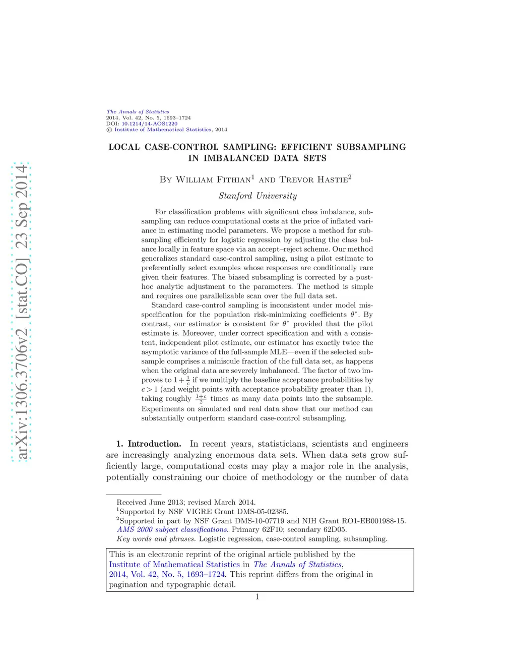 For classification problems with significant class imbalance, subsampling can reduce computational costs at the price of inflated variance in estimating model parameters. We propose a method for subsampling efficiently for logistic regression by adjusting the class balance locally in feature space via an accept-reject scheme. Our method generalizes standard case-control sampling, using a pilot estimate to preferentially select examples whose responses are conditionally rare given their features. The biased subsampling is corrected by a post-hoc analytic adjustment to the parameters. The method is simple and requires one parallelizable scan over the full data set. Standard case-control sampling is inconsistent under model misspecification for the population risk-minimizing coefficients . By contrast, our estimator is consistent for provided that the pilot estimate is. Moreover, under correct specification and with a consistent, independent pilot estimate, our estimator has exactly twice the asymptotic variance of the full-sample MLE - even if the selected subsample comprises a miniscule fraction of the full data set, as happens when the original data are severely imbalanced. The factor of two improves to if we multiply the baseline acceptance probabilities by (and weight points with acceptance probability greater than 1), taking roughly times as many data points into the subsample. Experiments on simulated and real data show that our method can substantially outperform standard case-control subsampling.