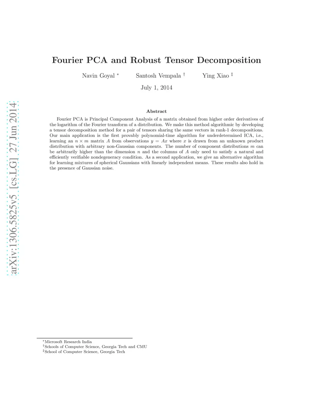 Fourier PCA is Principal Component Analysis of a matrix obtained from higher order derivatives of the logarithm of the Fourier transform of a distribution.We make this method algorithmic by developing a tensor decomposition method for a pair of tensors sharing the same vectors in rank- decompositions. Our main application is the first provably polynomial-time algorithm for underdetermined ICA, i.e., learning an matrix from observations where is drawn from an unknown product distribution with arbitrary non-Gaussian components. The number of component distributions can be arbitrarily higher than the dimension and the columns of only need to satisfy a natural and efficiently verifiable nondegeneracy condition. As a second application, we give an alternative algorithm for learning mixtures of spherical Gaussians with linearly independent means. These results also hold in the presence of Gaussian noise.