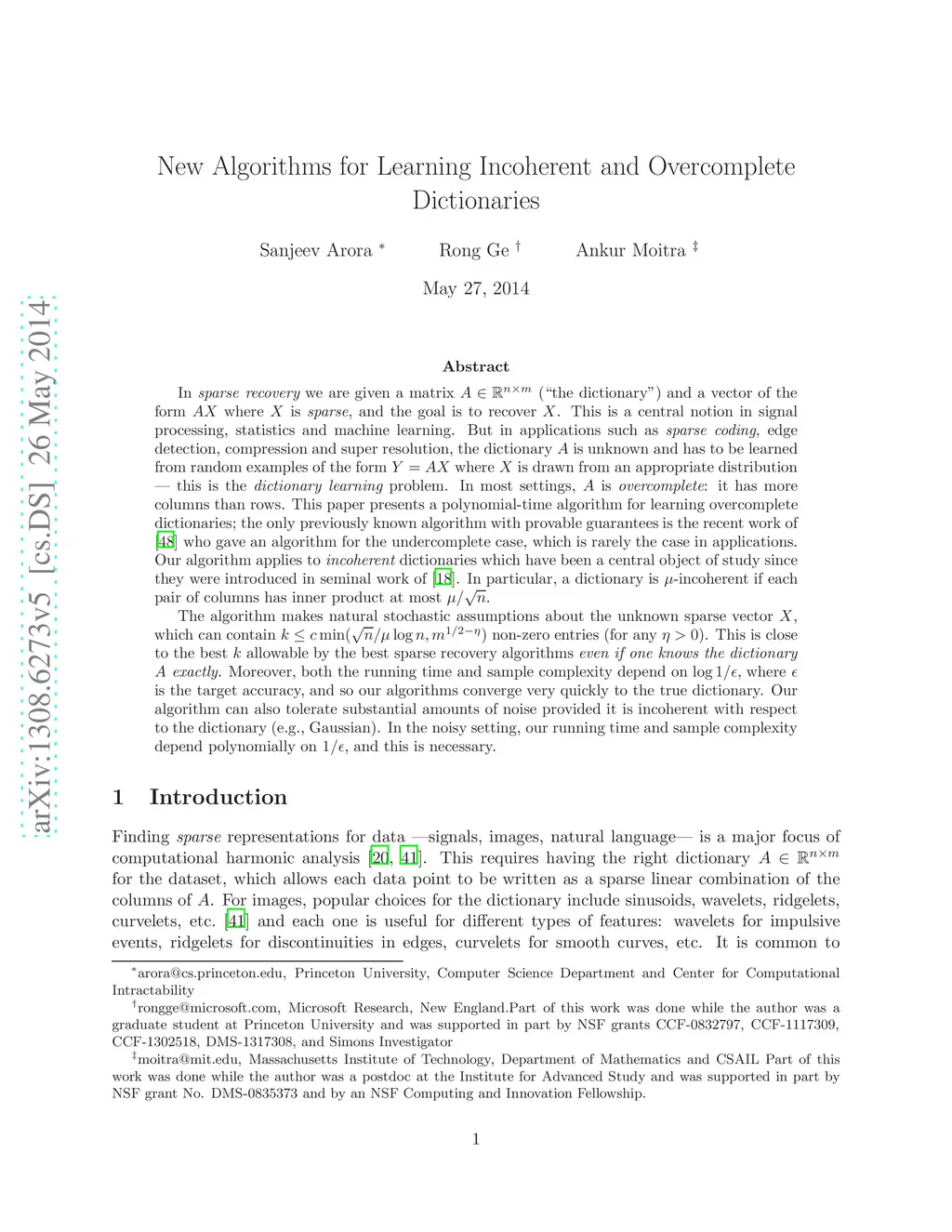 In sparse recovery we are given a matrix (the dictionary) and a vector of the form where is sparse, and the goal is to recover . This is a central notion in signal processing, statistics and machine learning. But in applications such as sparse coding, edge detection, compression and super resolution, the dictionary is unknown and has to be learned from random examples of the form where is drawn from an appropriate distribution --- this is the dictionary learning problem. In most settings, is overcomplete: it has more columns than rows. This paper presents a polynomial-time algorithm for learning overcomplete dictionaries; the only previously known algorithm with provable guarantees is the recent work of Spielman, Wang and Wright who gave an algorithm for the full-rank case, which is rarely the case in applications. Our algorithm applies to incoherent dictionaries which have been a central object of study since they were introduced in seminal work of Donoho and Huo. In particular, a dictionary is -incoherent if each pair of columns has inner product at most . The algorithm makes natural stochastic assumptions about the unknown sparse vector , which can contain non-zero entries (for any ). This is close to the best allowable by the best sparse recovery algorithms even if one knows the dictionary exactly. Moreover, both the running time and sample complexity depend on , where is the target accuracy, and so our algorithms converge very quickly to the true dictionary. Our algorithm can also tolerate substantial amounts of noise provided it is incoherent with respect to the dictionary (e.g., Gaussian). In the noisy setting, our running time and sample complexity depend polynomially on , and this is necessary.
