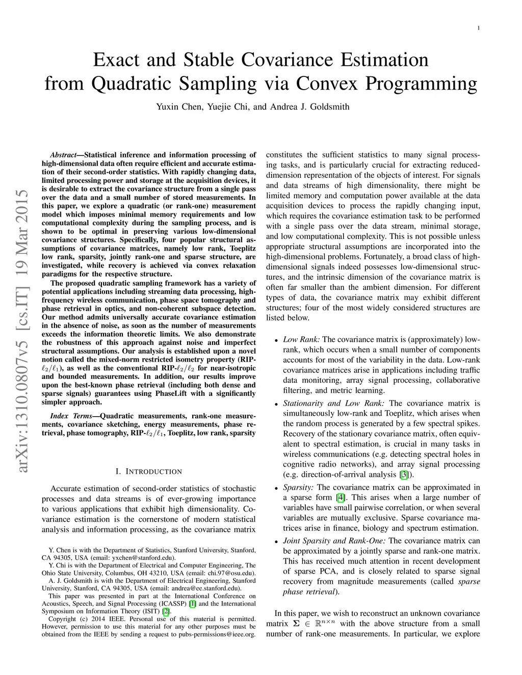 Statistical inference and information processing of high-dimensional data often require efficient and accurate estimation of their second-order statistics. With rapidly changing data, limited processing power and storage at the acquisition devices, it is desirable to extract the covariance structure from a single pass over the data and a small number of stored measurements. In this paper, we explore a quadratic (or rank-one) measurement model which imposes minimal memory requirements and low computational complexity during the sampling process, and is shown to be optimal in preserving various low-dimensional covariance structures. Specifically, four popular structural assumptions of covariance matrices, namely low rank, Toeplitz low rank, sparsity, jointly rank-one and sparse structure, are investigated, while recovery is achieved via convex relaxation paradigms for the respective structure. The proposed quadratic sampling framework has a variety of potential applications including streaming data processing, high-frequency wireless communication, phase space tomography and phase retrieval in optics, and non-coherent subspace detection. Our method admits universally accurate covariance estimation in the absence of noise, as soon as the number of measurements exceeds the information theoretic limits. We also demonstrate the robustness of this approach against noise and imperfect structural assumptions. Our analysis is established upon a novel notion called the mixed-norm restricted isometry property (RIP-), as well as the conventional RIP- for near-isotropic and bounded measurements. In addition, our results improve upon the best-known phase retrieval (including both dense and sparse signals) guarantees using PhaseLift with a significantly simpler approach.