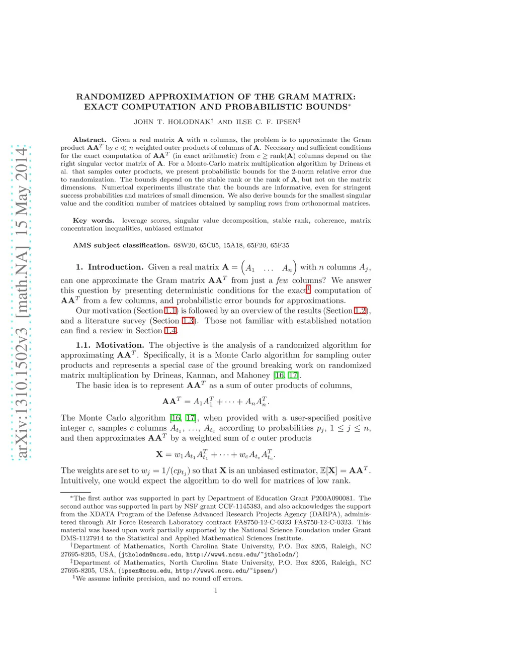 Randomized Approximation of the Gram Matrix: Exact Computation and