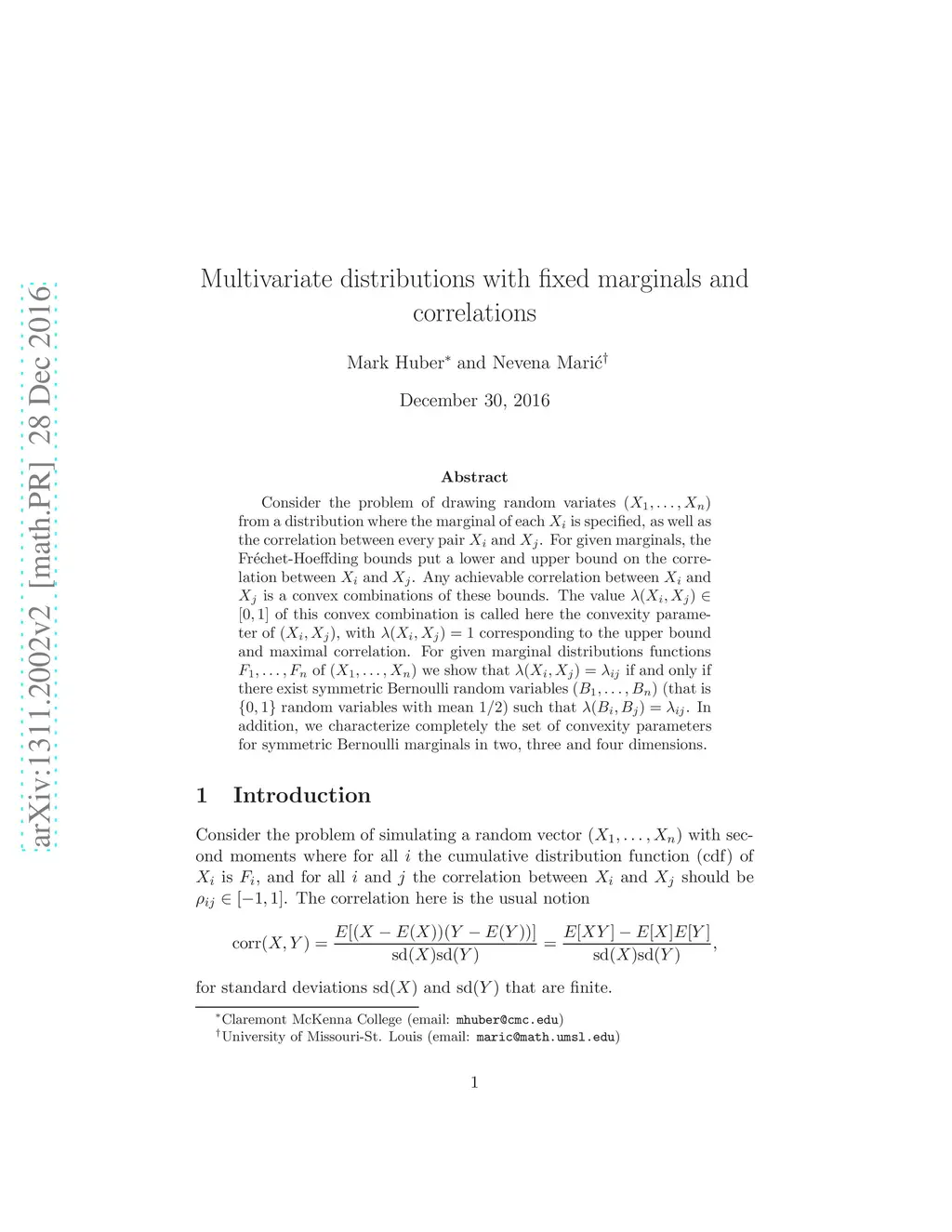 Consider the problem of drawing random variates from a distribution where the marginal of each is specified, as well as the correlation between every pair and . For given marginals, the Fr\échet-Hoeffding bounds put a lower and upper bound on the correlation between and . Any achievable correlation between and is a convex combinations of these bounds. The value of this convex combination is called here the convexity parameter of with corresponding to the upper bound and maximal correlation. For given marginal distributions functions of we show that if and only if there exist symmetric Bernoulli random variables (that is random variables with mean 1/2) such that . In addition, we characterize completely the set of convexity parameters for symmetric Bernoulli marginals in two, three and four dimensions.