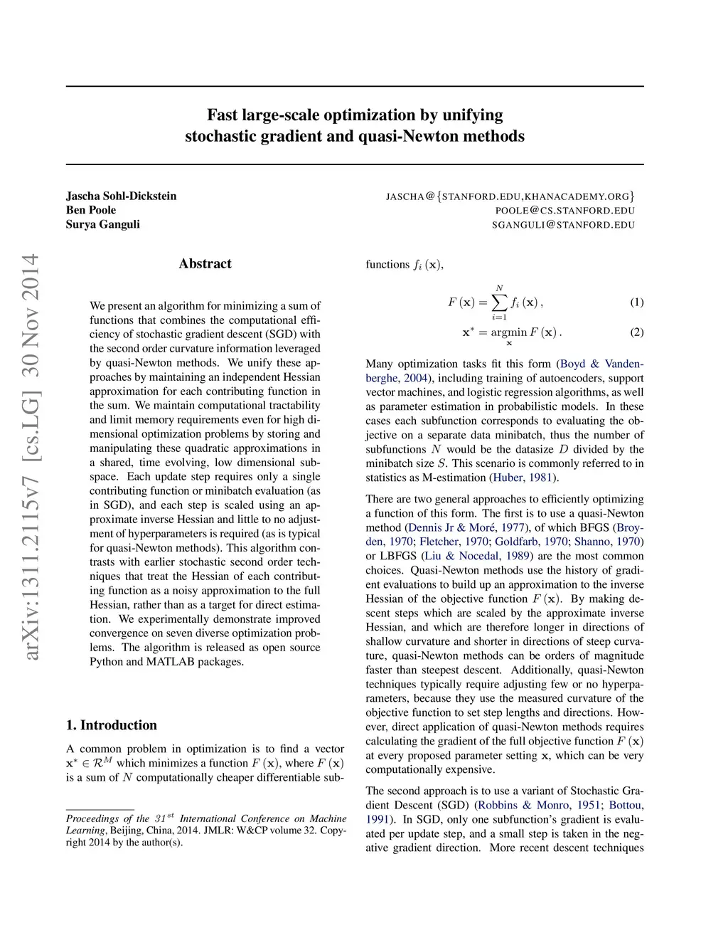 We present an algorithm for minimizing a sum of functions that combines the computational efficiency of stochastic gradient descent (SGD) with the second order curvature information leveraged by quasi-Newton methods. We unify these disparate approaches by maintaining an independent Hessian approximation for each contributing function in the sum. We maintain computational tractability and limit memory requirements even for high dimensional optimization problems by storing and manipulating these quadratic approximations in a shared, time evolving, low dimensional subspace. Each update step requires only a single contributing function or minibatch evaluation (as in SGD), and each step is scaled using an approximate inverse Hessian and little to no adjustment of hyperparameters is required (as is typical for quasi-Newton methods). This algorithm contrasts with earlier stochastic second order techniques that treat the Hessian of each contributing function as a noisy approximation to the full Hessian, rather than as a target for direct estimation. We experimentally demonstrate improved convergence on seven diverse optimization problems. The algorithm is released as open source Python and MATLAB packages.