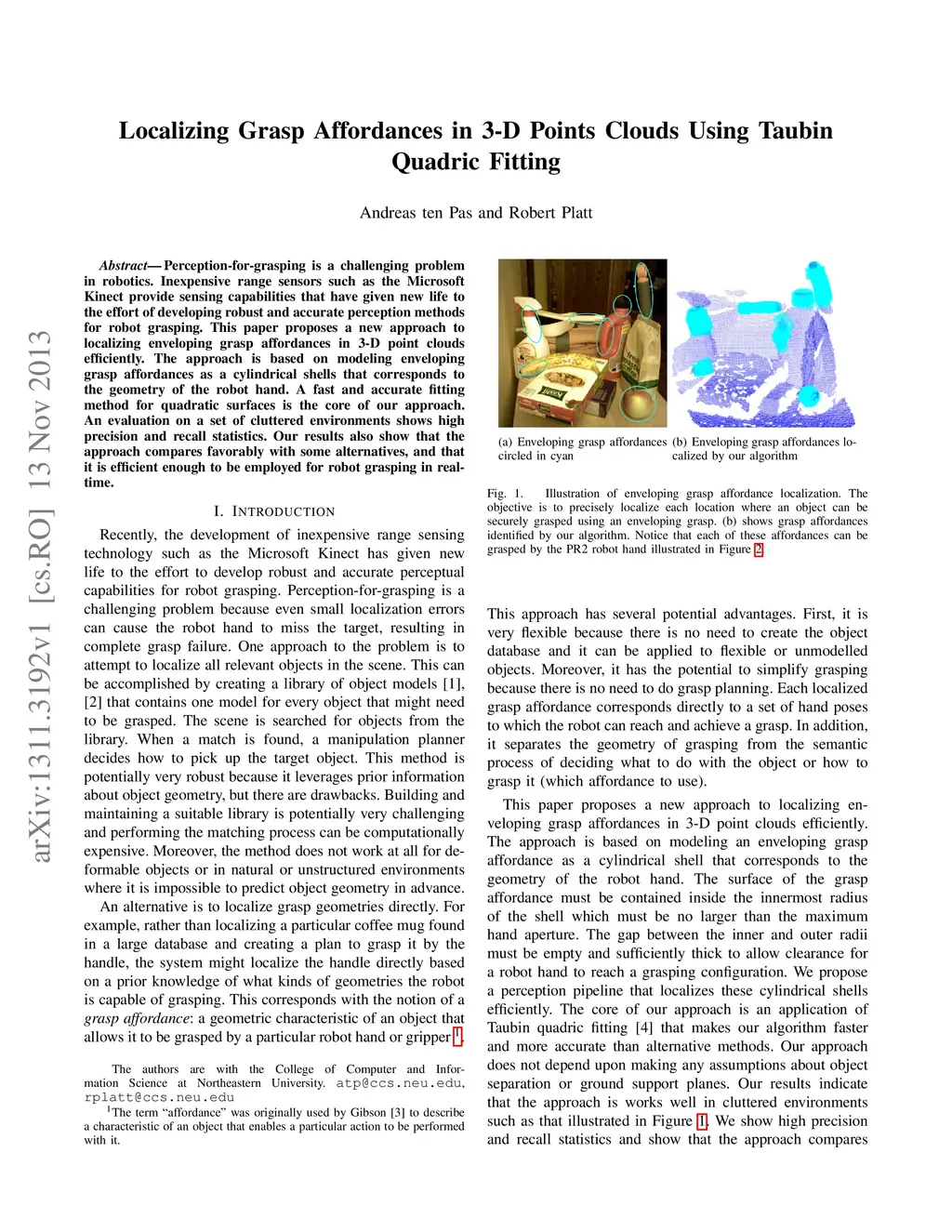 Localizing Grasp Affordances in 3-D Points Clouds Using Taubin Quadric
