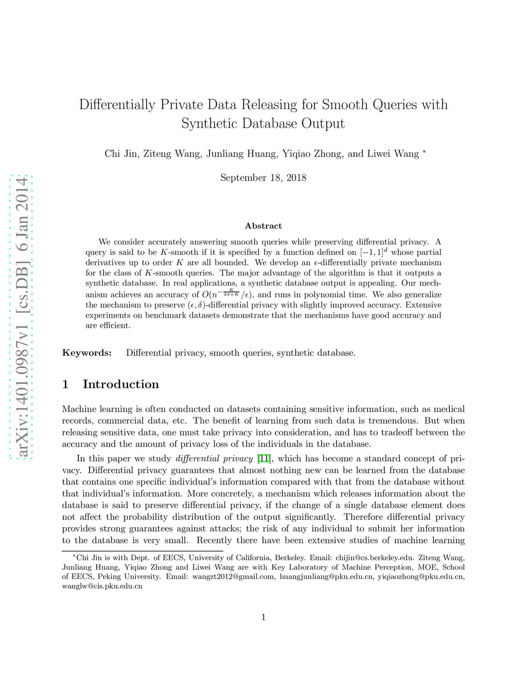 We consider accurately answering smooth queries while preserving differential privacy. A query is said to be -smooth if it is specified by a function defined on whose partial derivatives up to order are all bounded. We develop an -differentially private mechanism for the class of -smooth queries. The major advantage of the algorithm is that it outputs a synthetic database. In real applications, a synthetic database output is appealing. Our mechanism achieves an accuracy of , and runs in polynomial time. We also generalize the mechanism to preserve -differential privacy with slightly improved accuracy. Extensive experiments on benchmark datasets demonstrate that the mechanisms have good accuracy and are efficient.