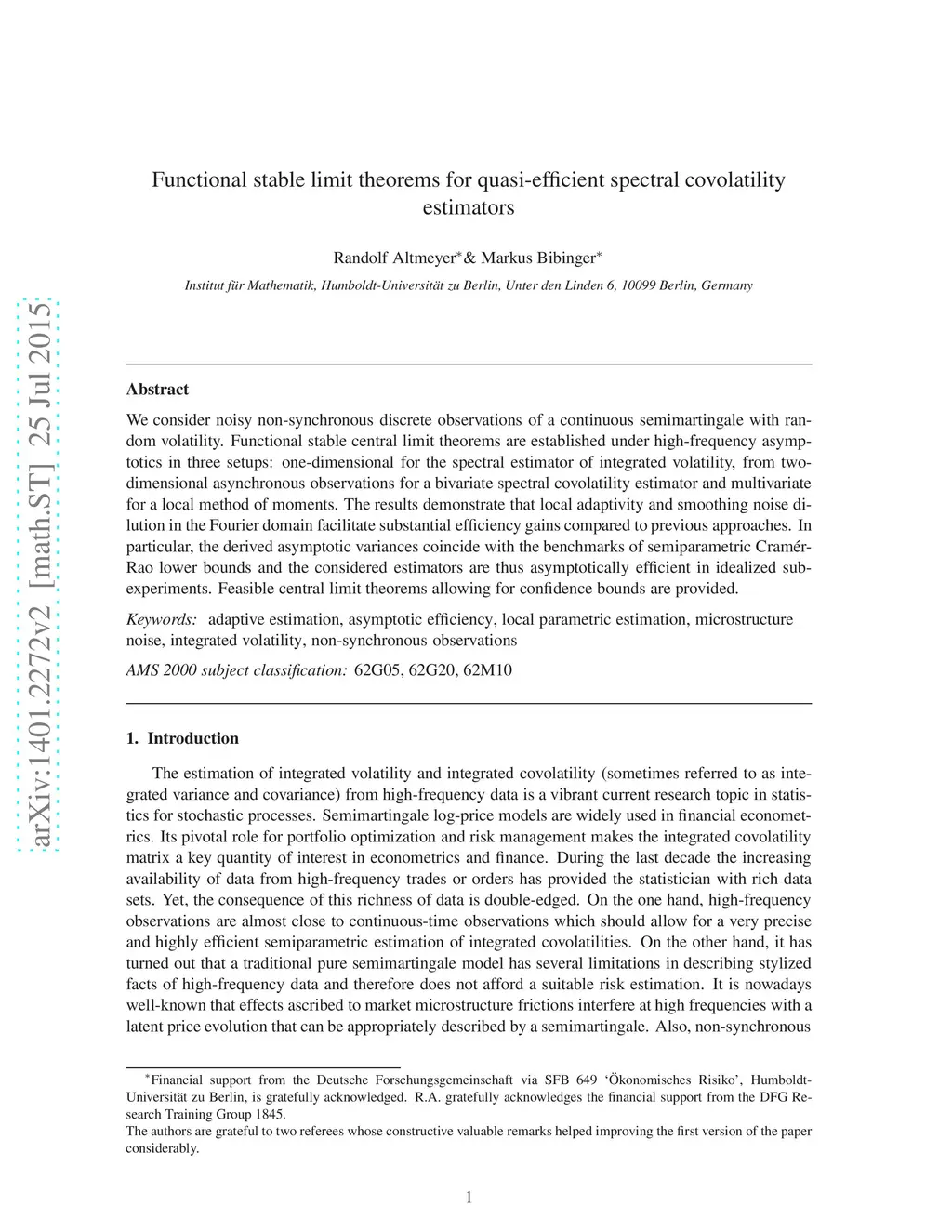 We consider noisy non-synchronous discrete observations of a continuous semimartingale with random volatility. Functional stable central limit theorems are established under high-frequency asymptotics in three setups: one-dimensional for the spectral estimator of integrated volatility, from two-dimensional asynchronous observations for a bivariate spectral covolatility estimator and multivariate for a local method of moments. The results demonstrate that local adaptivity and smoothing noise dilution in the Fourier domain facilitate substantial efficiency gains compared to previous approaches. In particular, the derived asymptotic variances coincide with the benchmarks of semiparametric Cram\ér-Rao lower bounds and the considered estimators are thus asymptotically efficient in idealized sub-experiments. Feasible central limit theorems allowing for confidence are provided.
