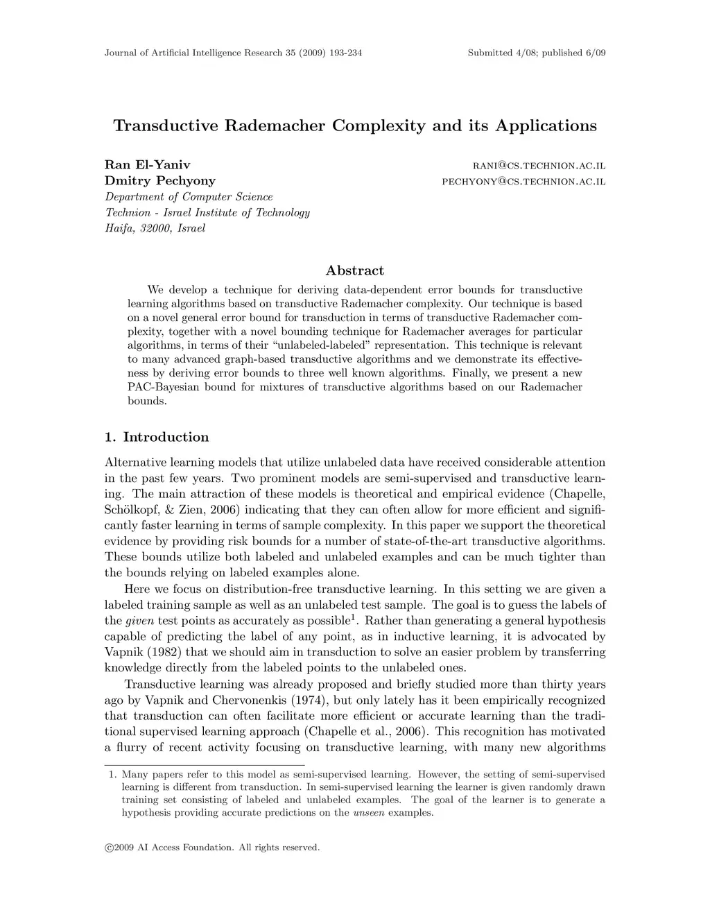 We develop a technique for deriving data-dependent error bounds for transductive learning algorithms based on transductive Rademacher complexity. Our technique is based on a novel general error bound for transduction in terms of transductive Rademacher complexity, together with a novel bounding technique for Rademacher averages for particular algorithms, in terms of their "unlabeled-labeled" representation. This technique is relevant to many advanced graph-based transductive algorithms and we demonstrate its effectiveness by deriving error bounds to three well known algorithms. Finally, we present a new PAC-Bayesian bound for mixtures of transductive algorithms based on our Rademacher bounds.