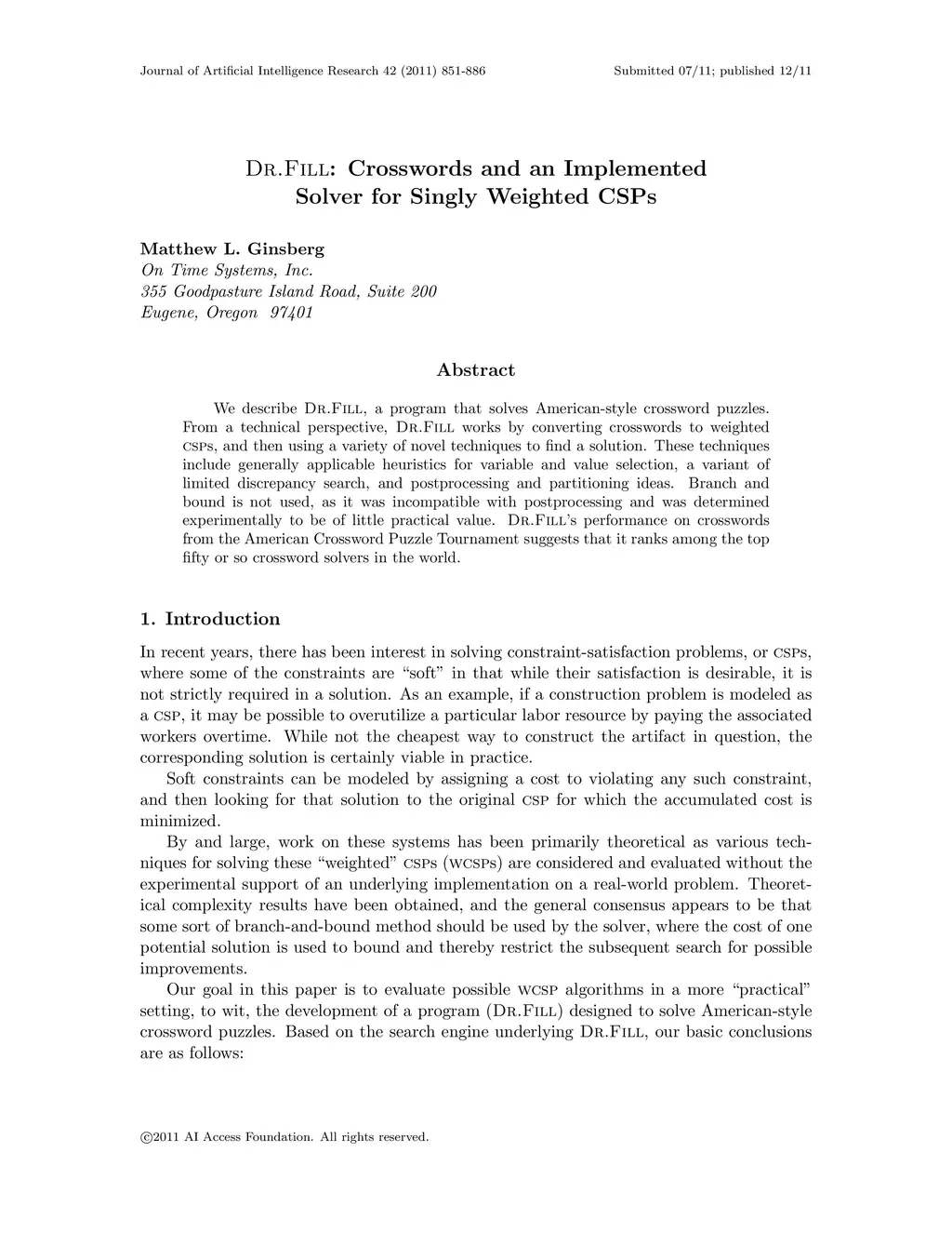 Dr.Fill: Crosswords and an Implemented Solver for Singly Weighted CSPs