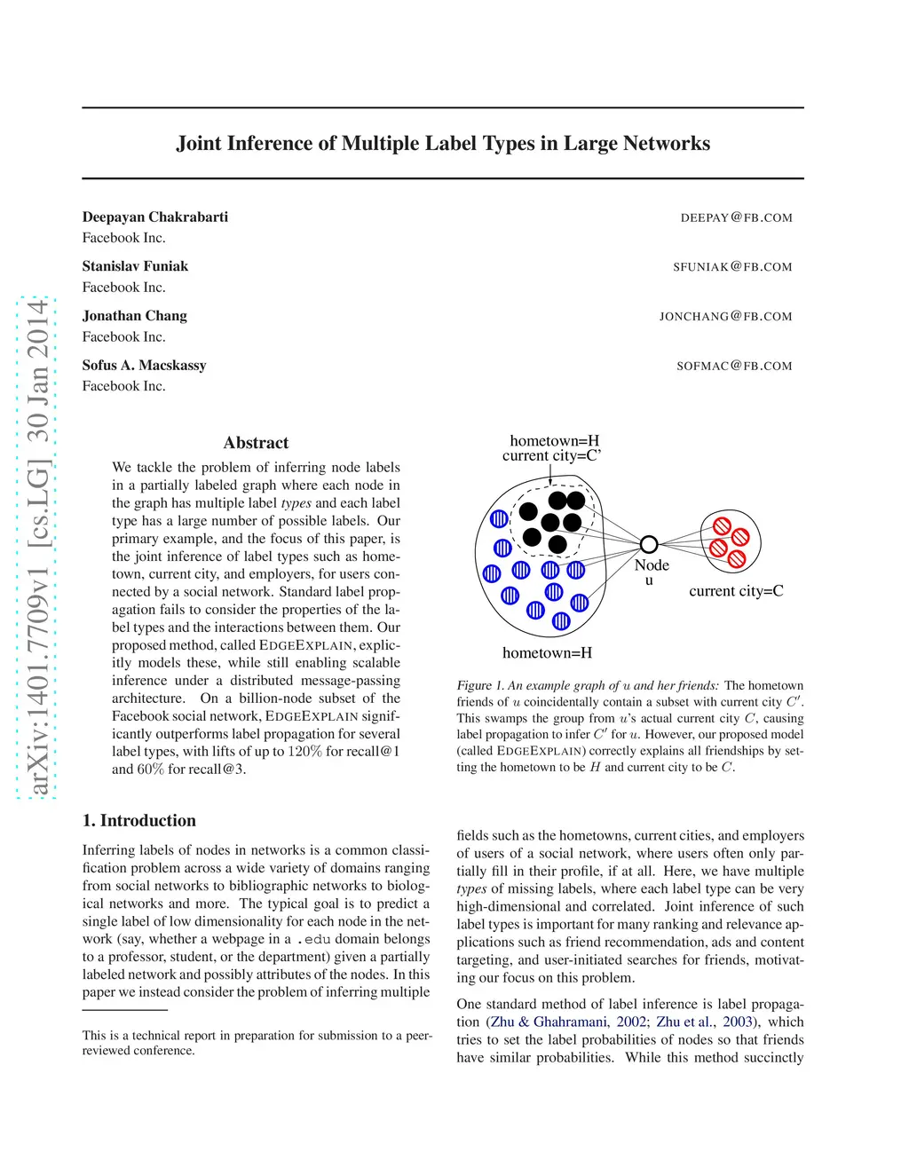 We tackle the problem of inferring node labels in a partially labeled graph where each node in the graph has multiple label types and each label type has a large number of possible labels. Our primary example, and the focus of this paper, is the joint inference of label types such as hometown, current city, and employers, for users connected by a social network. Standard label propagation fails to consider the properties of the label types and the interactions between them. Our proposed method, called EdgeExplain, explicitly models these, while still enabling scalable inference under a distributed message-passing architecture. On a billion-node subset of the Facebook social network, EdgeExplain significantly outperforms label propagation for several label types, with lifts of up to 120% for recall@1 and 60% for recall@3.