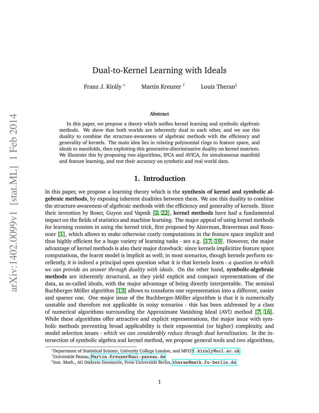 In this paper, we propose a theory which unifies kernel learning and symbolic algebraic methods. We show that both worlds are inherently dual to each other, and we use this duality to combine the structure-awareness of algebraic methods with the efficiency and generality of kernels. The main idea lies in relating polynomial rings to feature space, and ideals to manifolds, then exploiting this generative-discriminative duality on kernel matrices. We illustrate this by proposing two algorithms, IPCA and AVICA, for simultaneous manifold and feature learning, and test their accuracy on synthetic and real world data.