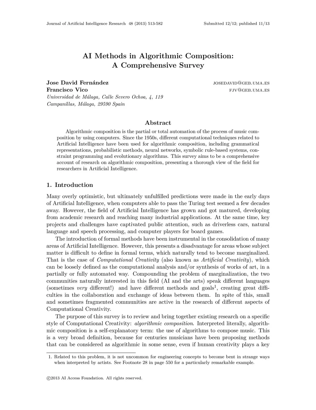 Algorithmic composition is the partial or total automation of the process of music composition by using computers. Since the 1950s, different computational techniques related to Artificial Intelligence have been used for algorithmic composition, including grammatical representations, probabilistic methods, neural networks, symbolic rule-based systems, constraint programming and evolutionary algorithms. This survey aims to be a comprehensive account of research on algorithmic composition, presenting a thorough view of the field for researchers in Artificial Intelligence.