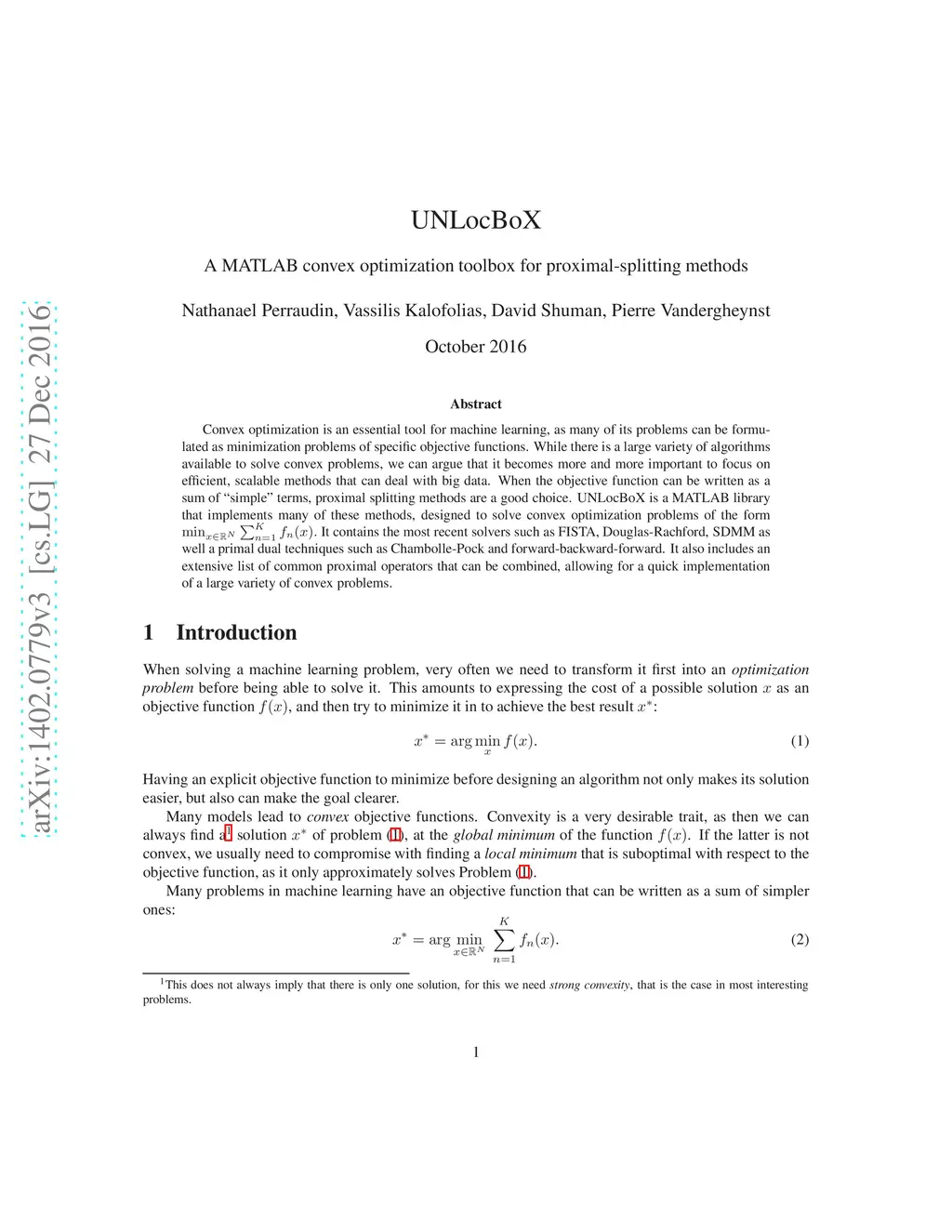 Convex optimization is an essential tool for machine learning, as many of its problems can be formulated as minimization problems of specific objective functions. While there is a large variety of algorithms available to solve convex problems, we can argue that it becomes more and more important to focus on efficient, scalable methods that can deal with big data. When the objective function can be written as a sum of "simple" terms, proximal splitting methods are a good choice. UNLocBoX is a MATLAB library that implements many of these methods, designed to solve convex optimization problems of the form It contains the most recent solvers such as FISTA, Douglas-Rachford, SDMM as well a primal dual techniques such as Chambolle-Pock and forward-backward-forward. It also includes an extensive list of common proximal operators that can be combined, allowing for a quick implementation of a large variety of convex problems.
