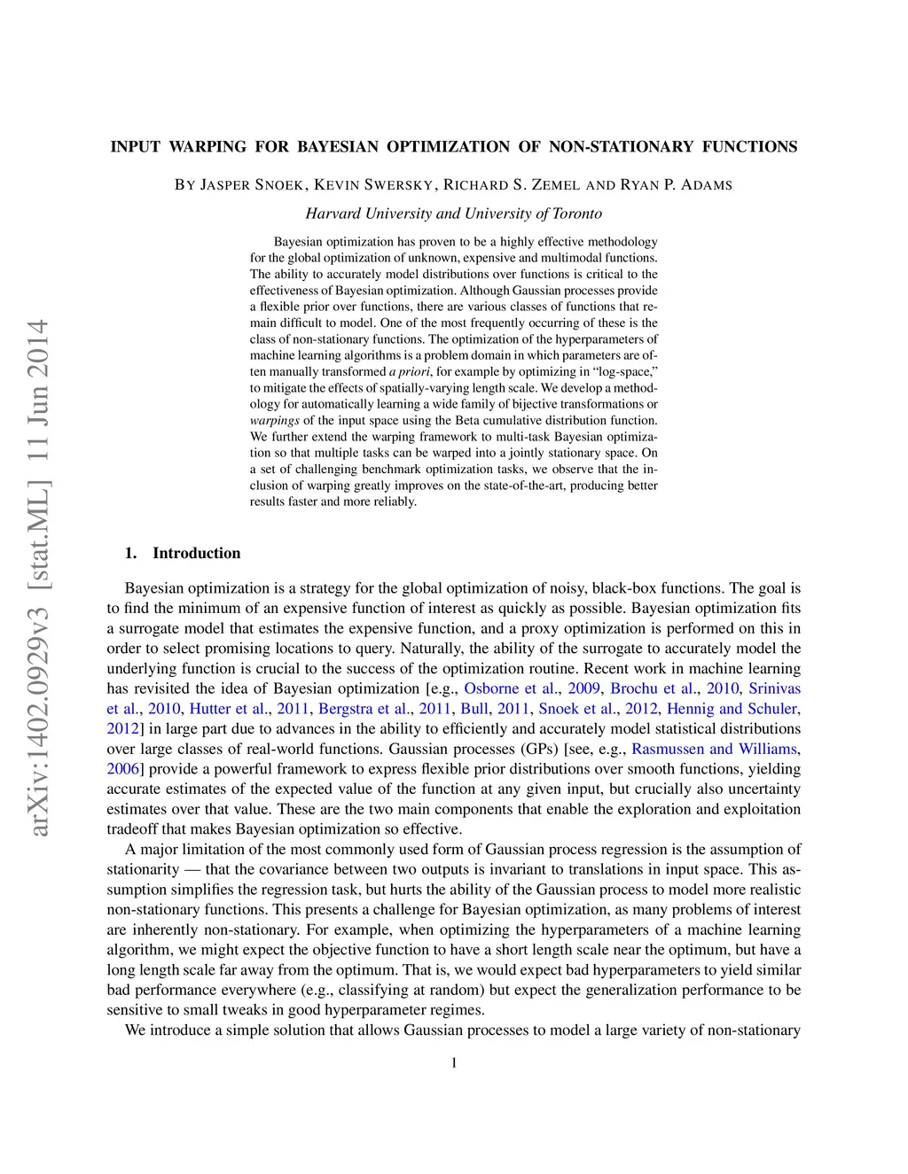 Bayesian optimization has proven to be a highly effective methodology for the global optimization of unknown, expensive and multimodal functions. The ability to accurately model distributions over functions is critical to the effectiveness of Bayesian optimization. Although Gaussian processes provide a flexible prior over functions which can be queried efficiently, there are various classes of functions that remain difficult to model. One of the most frequently occurring of these is the class of non-stationary functions. The optimization of the hyperparameters of machine learning algorithms is a problem domain in which parameters are often manually transformed a priori, for example by optimizing in "log-space," to mitigate the effects of spatially-varying length scale. We develop a methodology for automatically learning a wide family of bijective transformations or warpings of the input space using the Beta cumulative distribution function. We further extend the warping framework to multi-task Bayesian optimization so that multiple tasks can be warped into a jointly stationary space. On a set of challenging benchmark optimization tasks, we observe that the inclusion of warping greatly improves on the state-of-the-art, producing better results faster and more reliably.