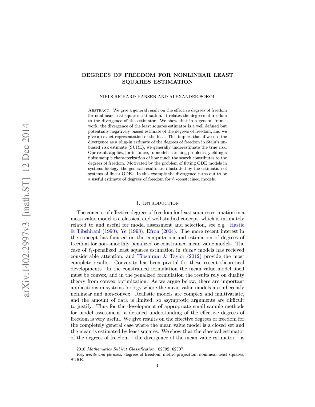 We give a general result on the effective degrees of freedom for nonlinear least squares estimation, which relates the degrees of freedom to the divergence of the estimator. We show that in a general framework, the divergence of the least squares estimator is a well defined but potentially negatively biased estimate of the degrees of freedom, and we give an exact representation of the bias. This implies that if we use the divergence as a plug-in estimate of the degrees of freedom in Stein's unbiased risk estimate (SURE), we generally underestimate the true risk. Our result applies, for instance, to model searching problems, yielding a finite sample characterization of how much the search contributes to the degrees of freedom. Motivated by the problem of fitting ODE models in systems biology, the general results are illustrated by the estimation of systems of linear ODEs. In this example the divergence turns out to be a useful estimate of degrees of freedom for -constrained models.