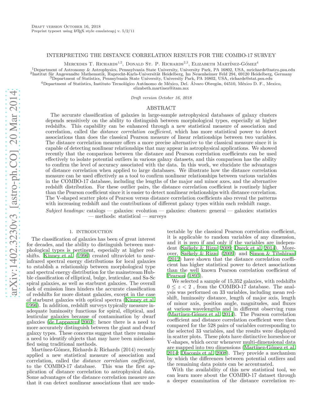 The accurate classification of galaxies in large-sample astrophysical databases of galaxy clusters depends sensitively on the ability to distinguish between morphological types, especially at higher redshifts. This capability can be enhanced through a new statistical measure of association and correlation, called the {\it distance correlation coefficient}, which has more statistical power to detect associations than does the classical Pearson measure of linear relationships between two variables. The distance correlation measure offers a more precise alternative to the classical measure since it is capable of detecting nonlinear relationships that may appear in astrophysical applications. We showed recently that the comparison between the distance and Pearson correlation coefficients can be used effectively to isolate potential outliers in various galaxy datasets, and this comparison has the ability to confirm the level of accuracy associated with the data. In this work, we elucidate the advantages of distance correlation when applied to large databases. We illustrate how the distance correlation measure can be used effectively as a tool to confirm nonlinear relationships between various variables in the COMBO-17 database, including the lengths of the major and minor axes, and the alternative redshift distribution. For these outlier pairs, the distance correlation coefficient is routinely higher than the Pearson coefficient since it is easier to detect nonlinear relationships with distance correlation. The V-shaped scatterplots of Pearson versus distance correlation coefficients also reveal the patterns with increasing redshift and the contributions of different galaxy types within each redshift range.